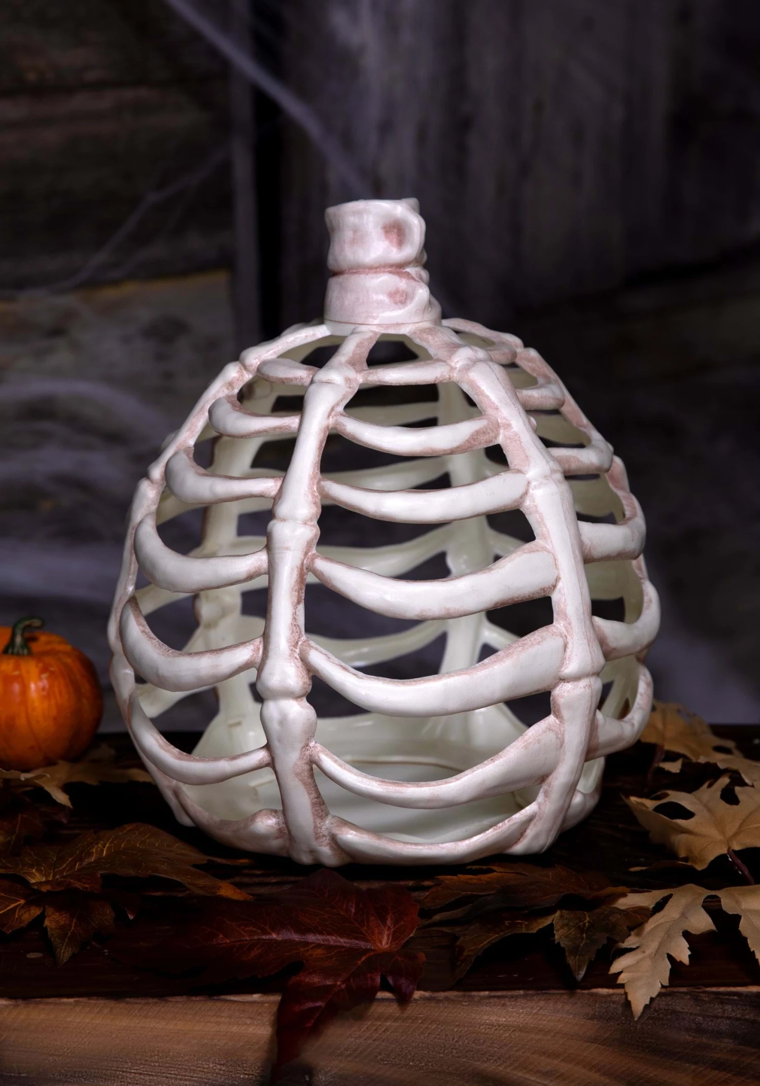 You’ve never seen a gourd as ghoulish as this 11-Inch Bone Pumpkin Halloween Decoration! The plastic accessory is painted a weathered white and is molded to look like a pumpkin made of interlocked bones with a spinal column “stem” on the top.