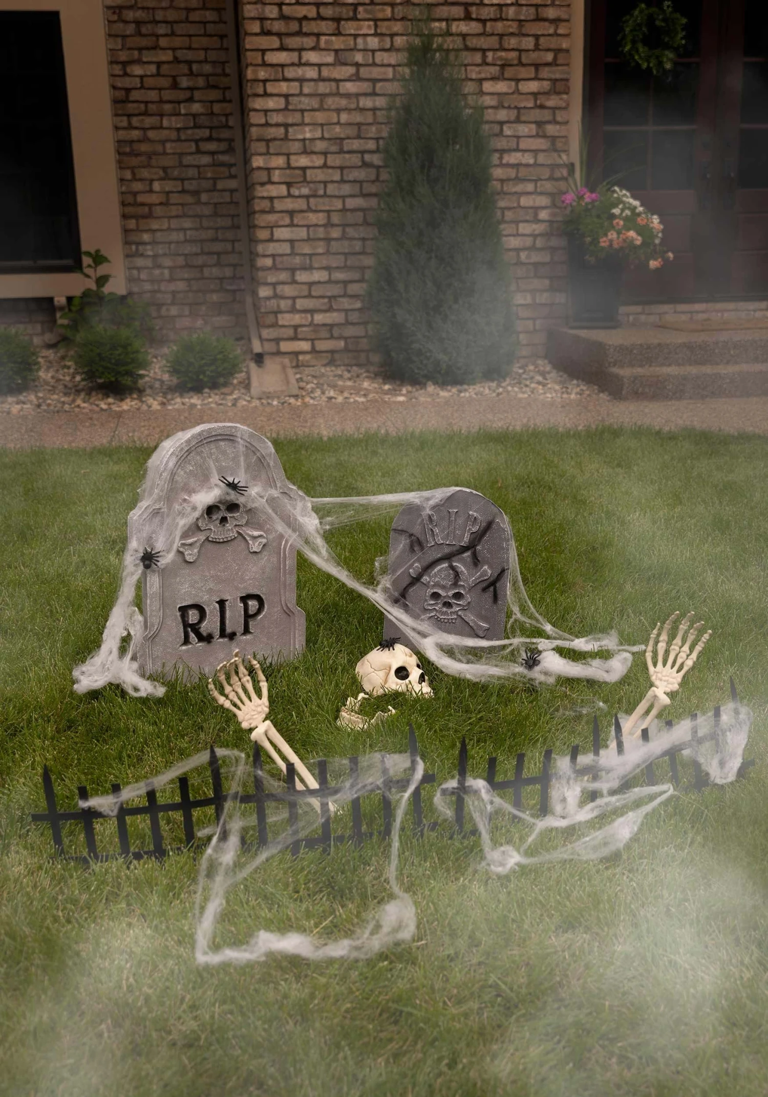 - Plastic ground stakes slide into holes in bases of tombstones, then into ground
