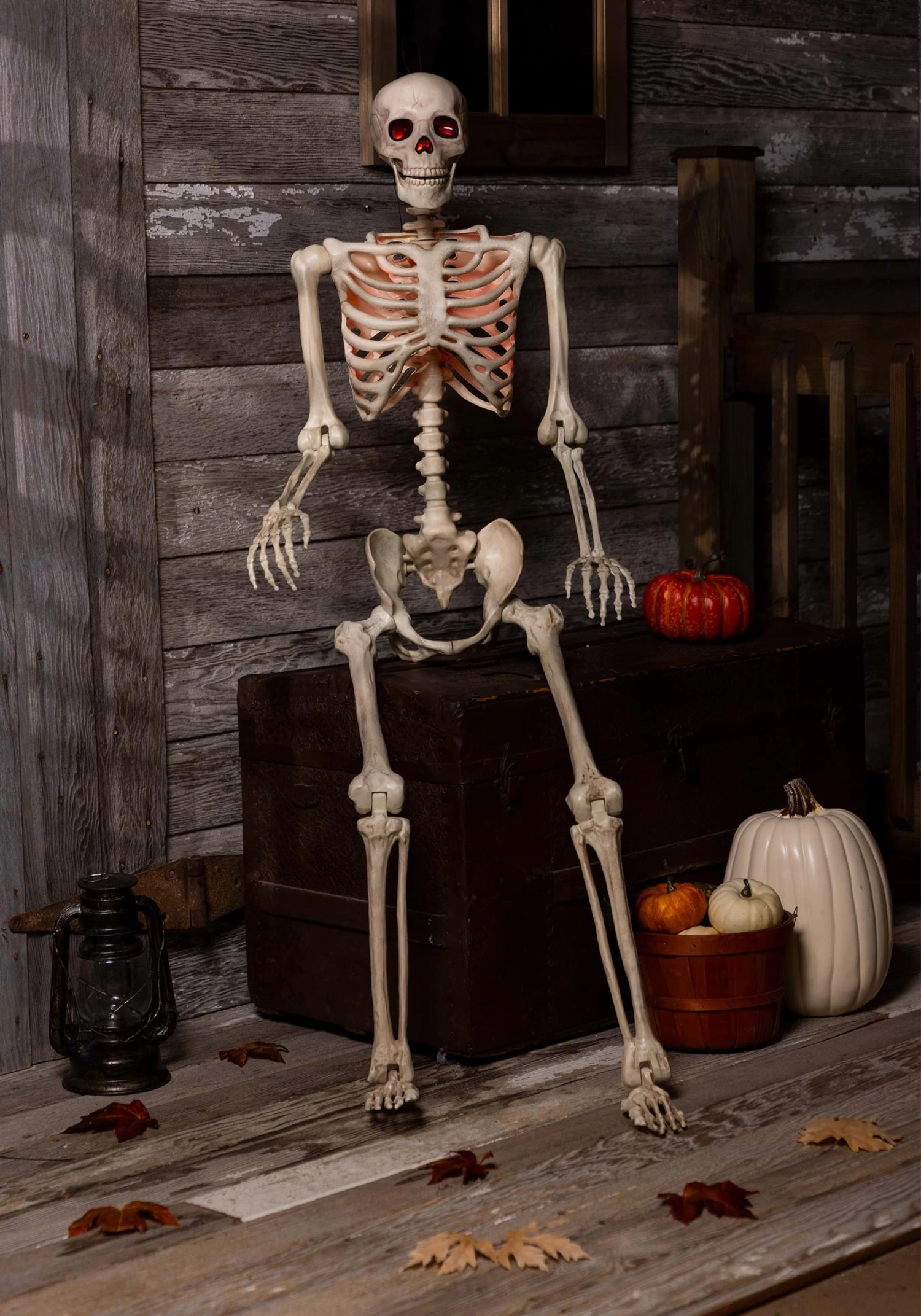 Set a scary scene using this 5FT Poseable Skeleton Decoration with Red Light Up Face & Chest! The realistic skeleton is made of molded plastic with racheted arm and leg joints that can hold a pose. When activated, its eye sockets and chest compartment glow red. A cord loop is attached to the top of the skull for hanging purposes.