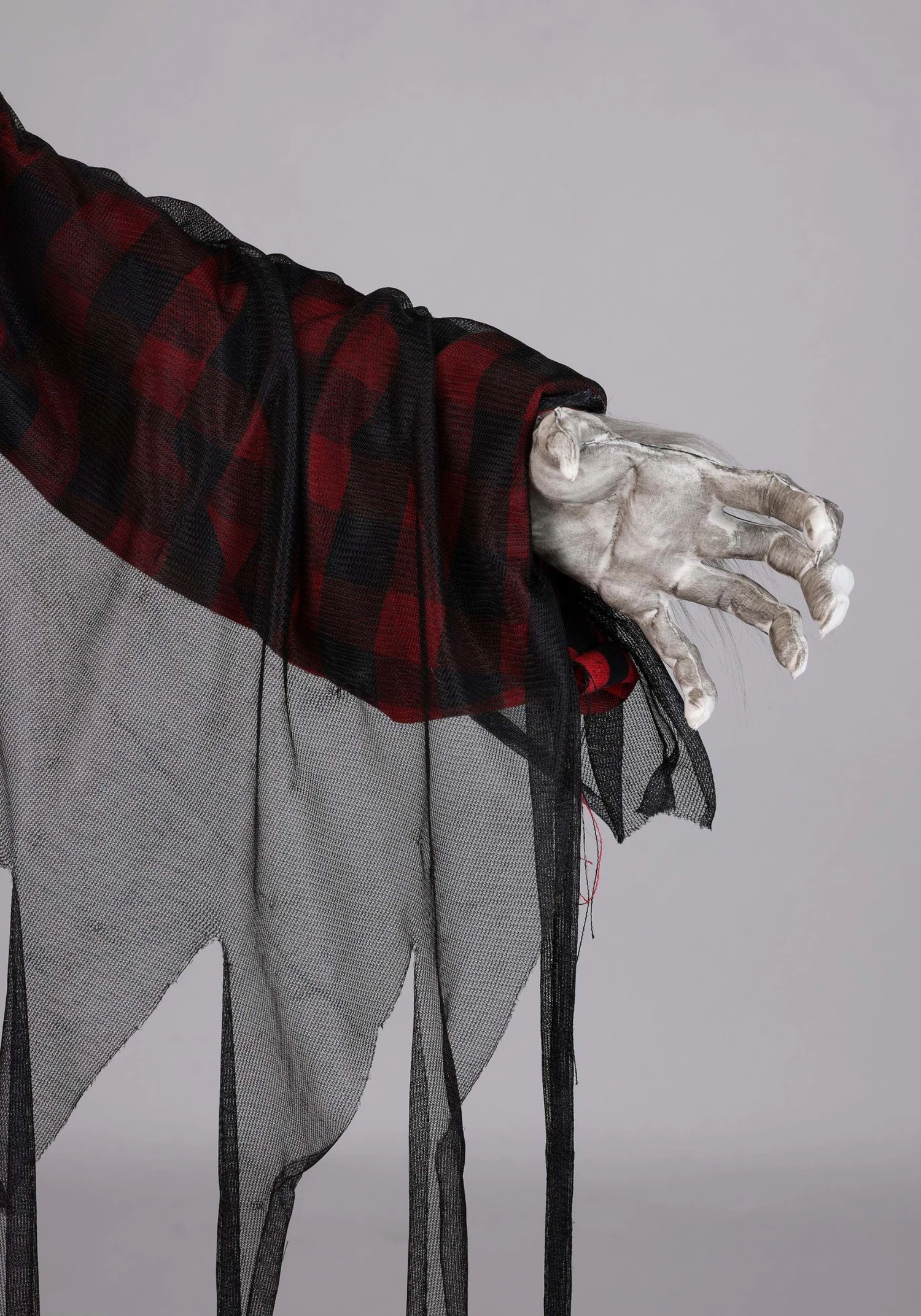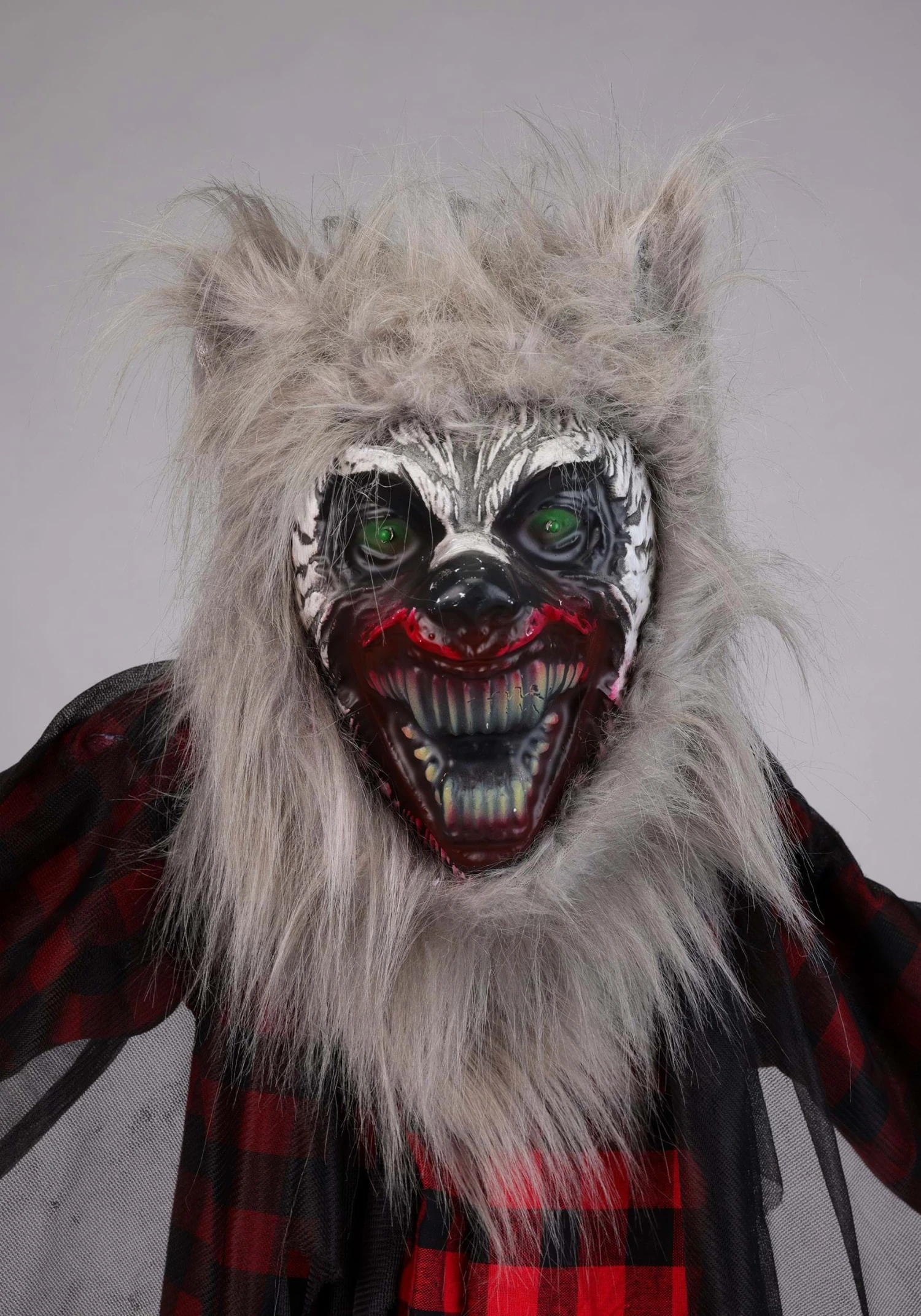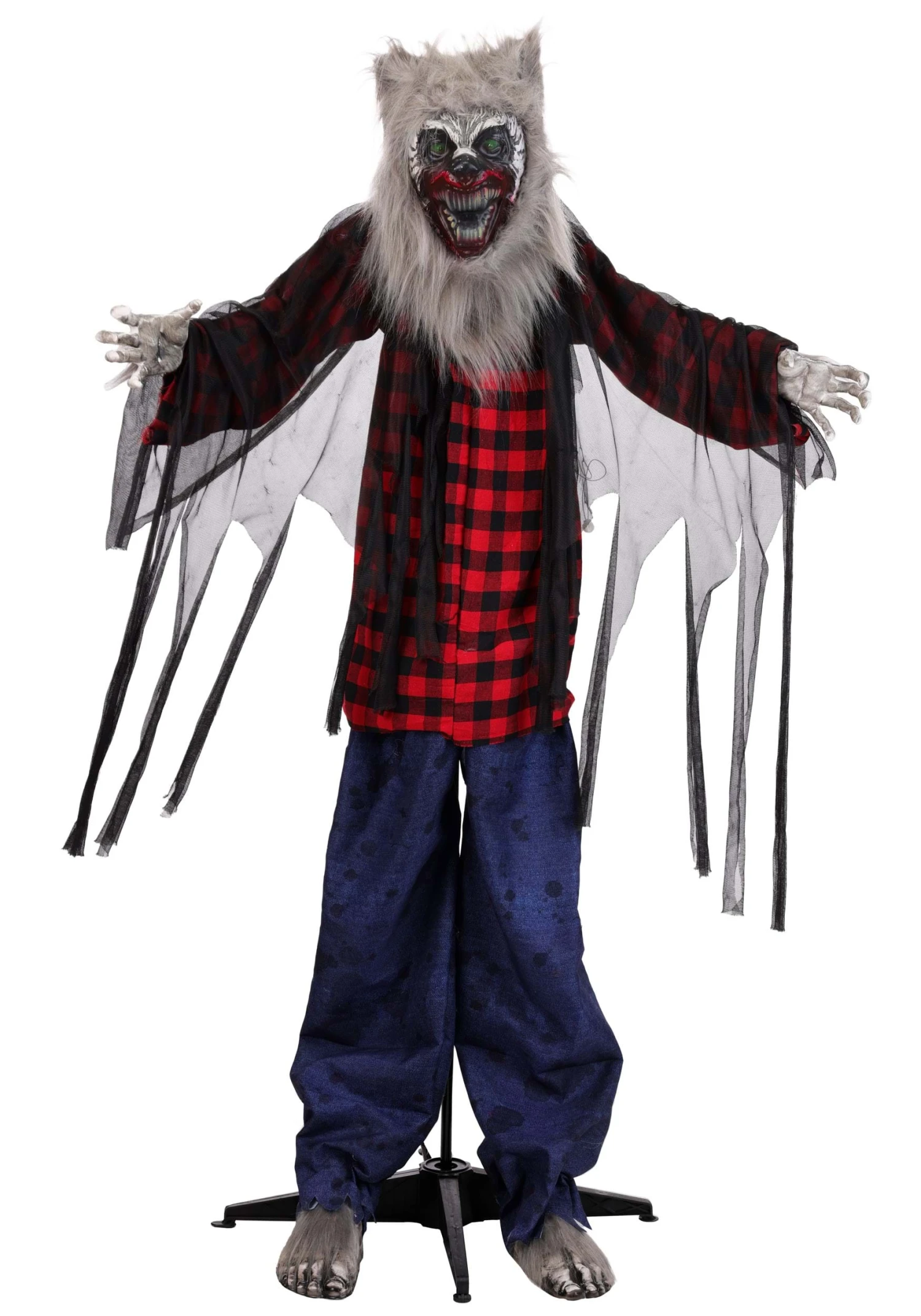 This 61-inch animatronic beast features a molded foam face with wild detail: sculpted fangs, painted snarl lines, and flashing red eyes that say, “I definitely bite.” Lucian’s wearing what used to be a plaid shirt before all that “being cursed” stuff shredded his wardrobe. A tan robe and layered gauze add to the crypt chic, while faux fur accents complete his feral makeover.