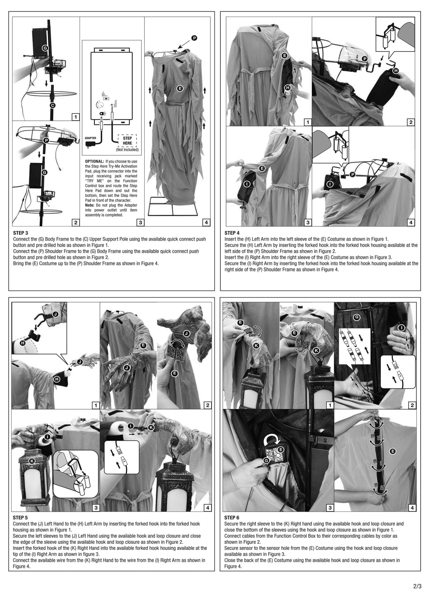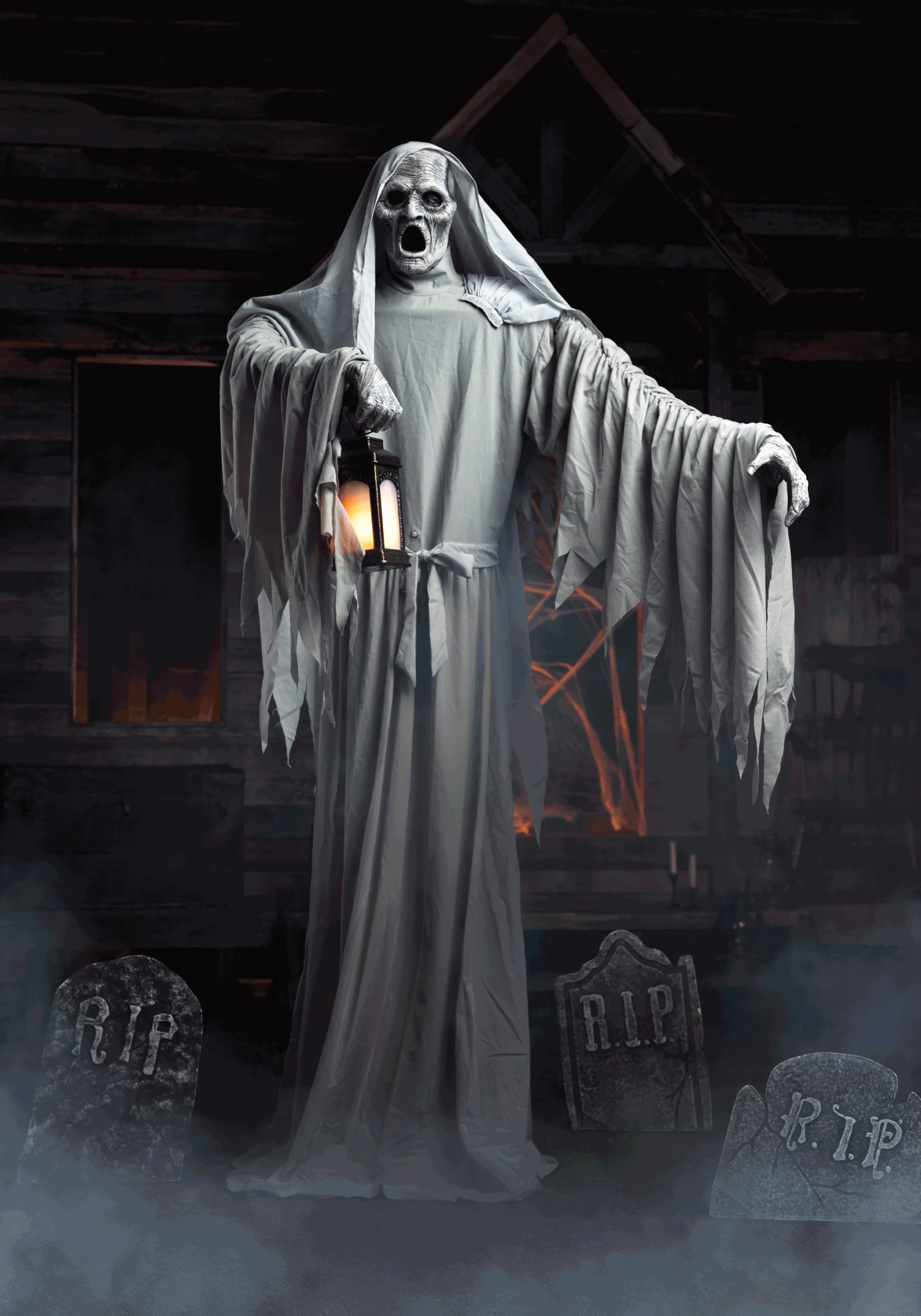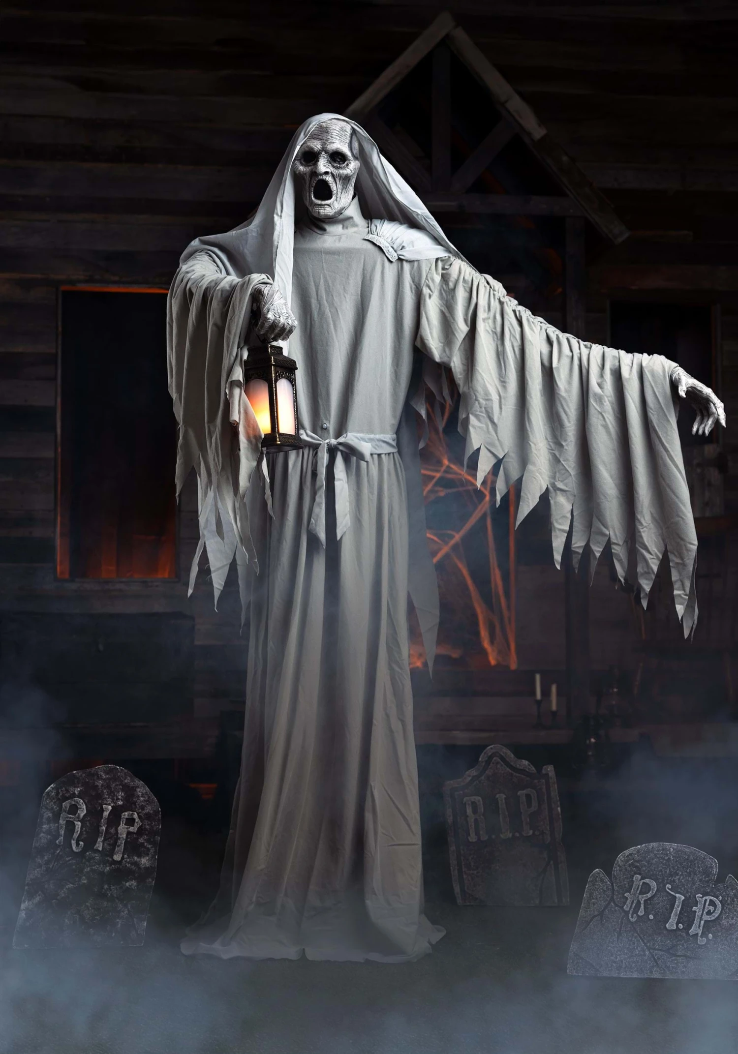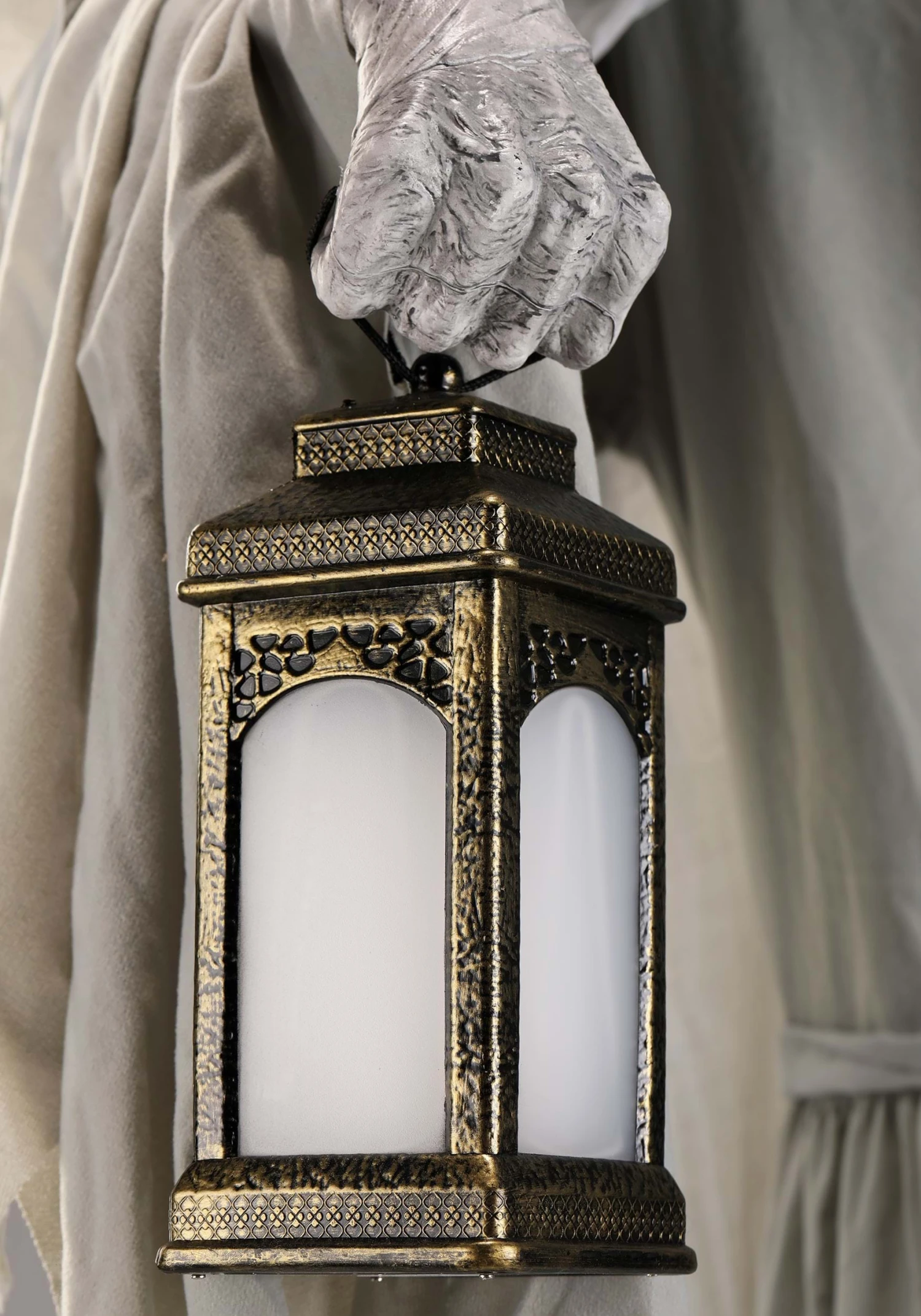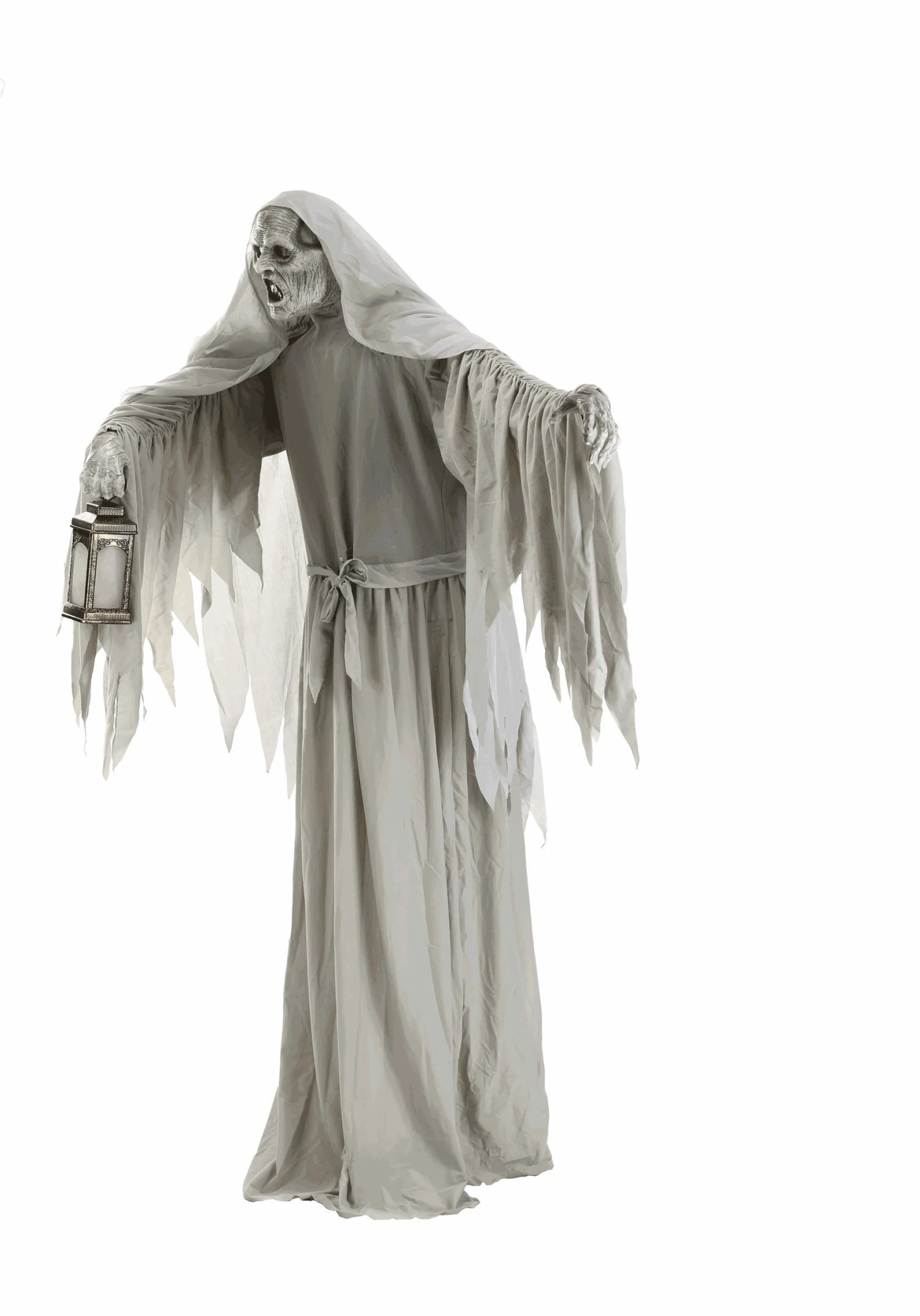 - Animatronic rotates its torso left and right, shifts its arms across its body, neutral back light illuminates the figure’s face yellow light inside lantern,