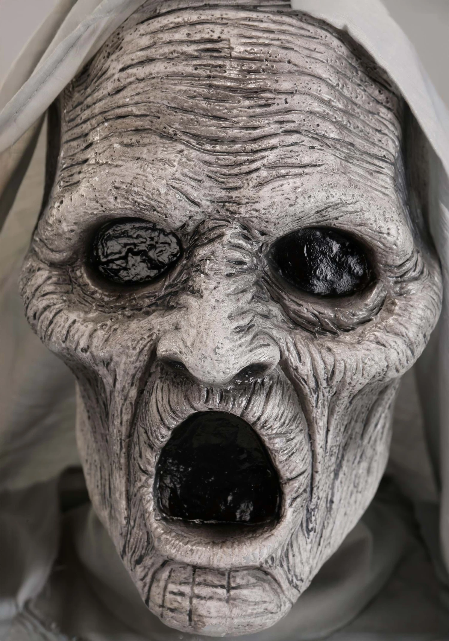 Meanwhile, the head and hands give the animatronic a delightfully unnerving look with deep wrinkles, hollow eyes, cheeks, and a gaping mouth. The grey color palette ensures the intricate sculpting really pops even against a matching robe and draped headcover.