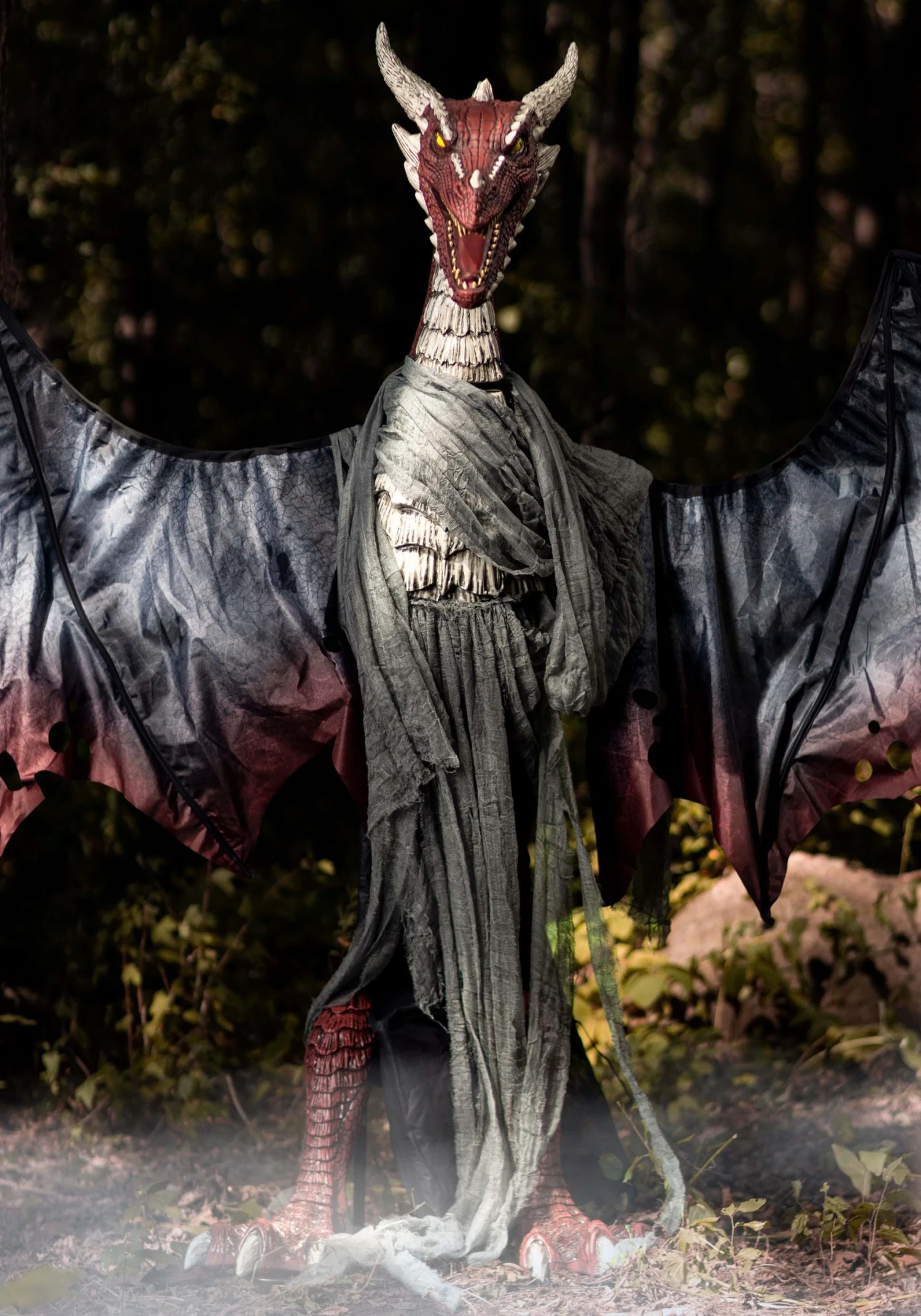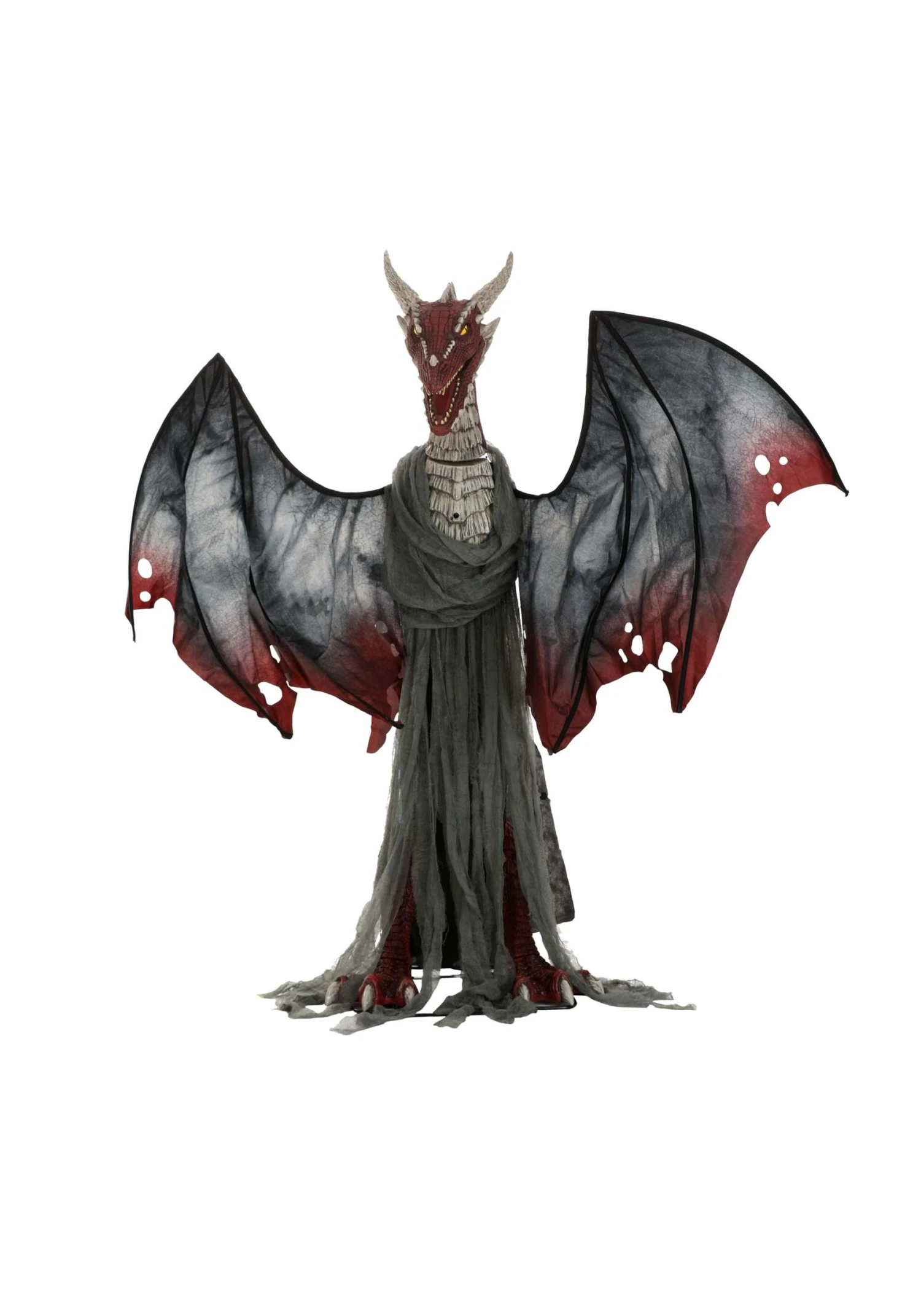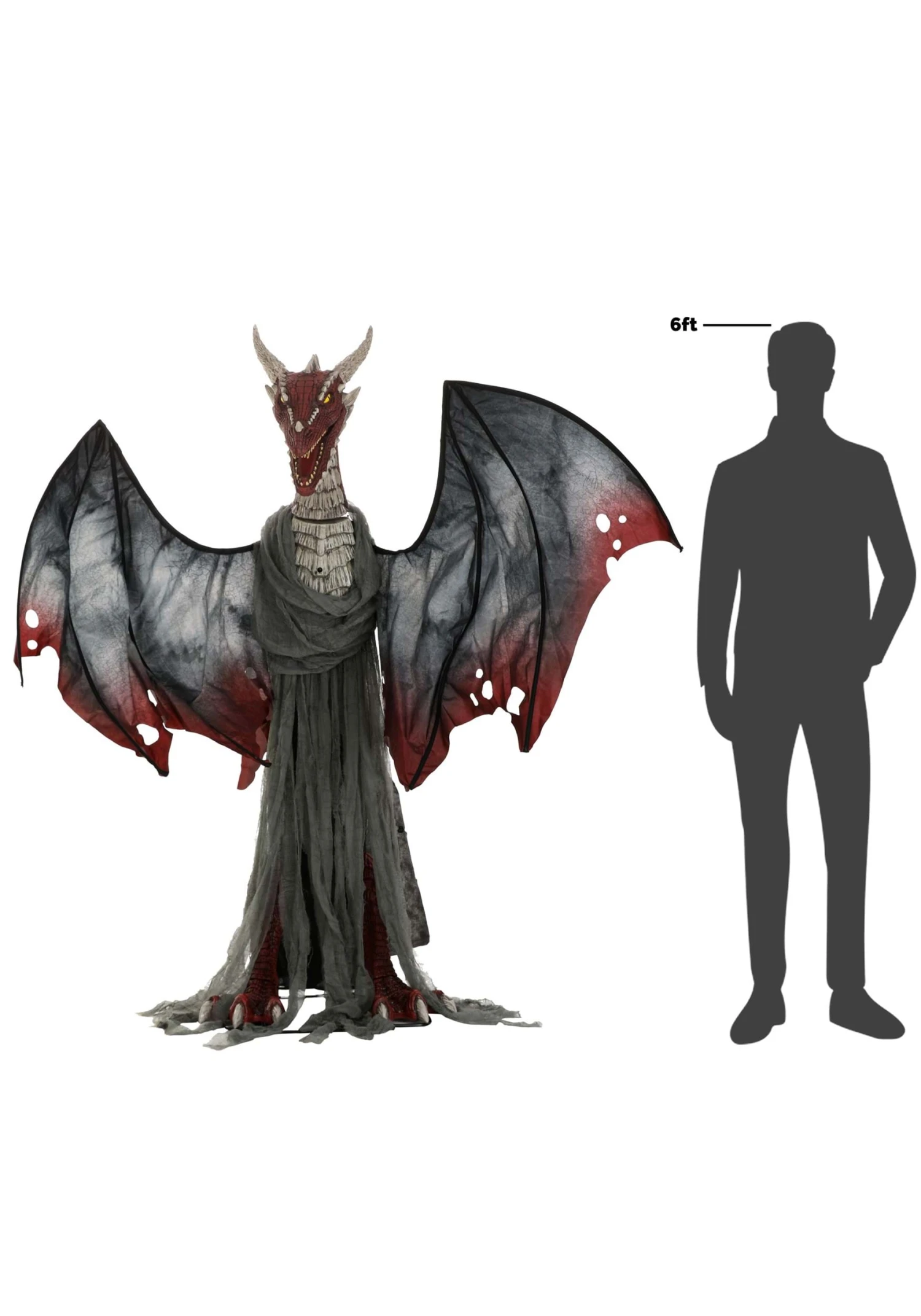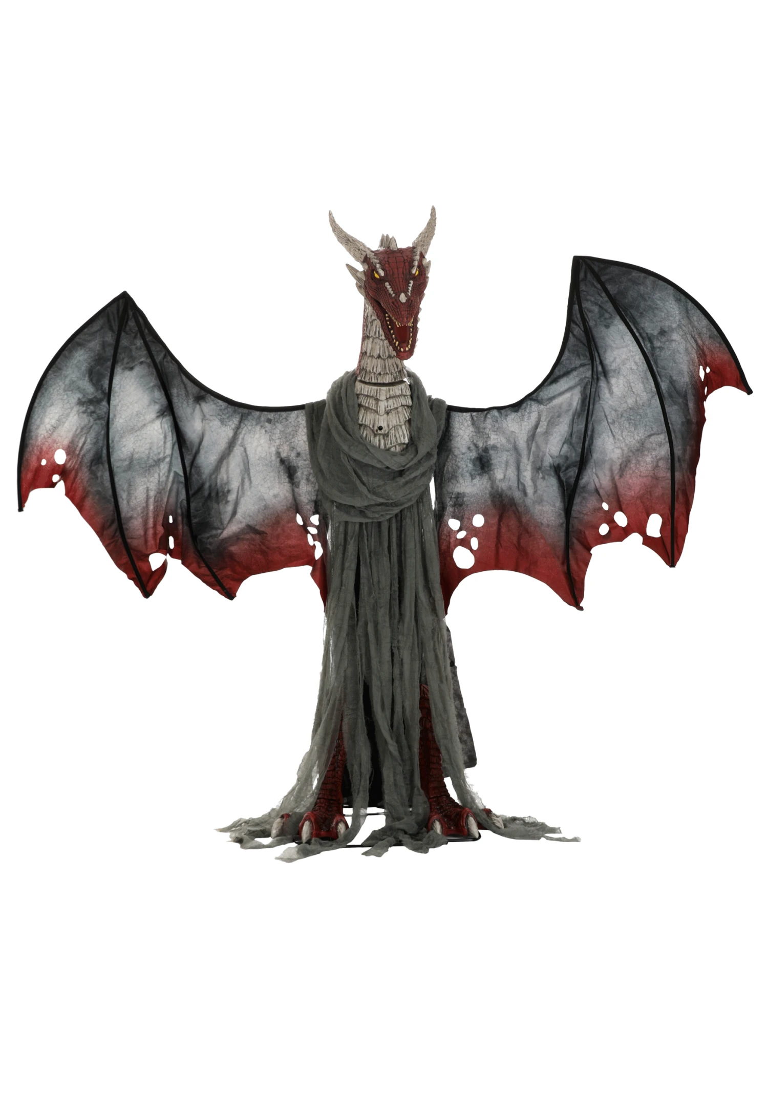 Make sure that your dwelling has its very own protector when you bring home this Animated Brimstone Dragon decoration. This genius design features components with metal framework, covered in molded latex for a detailed look, and fabric wings to bring this draconic decoration to life. After construction, support poles and braces keep this 6-foot-tall animated ornament sturdy and looking truly magical!