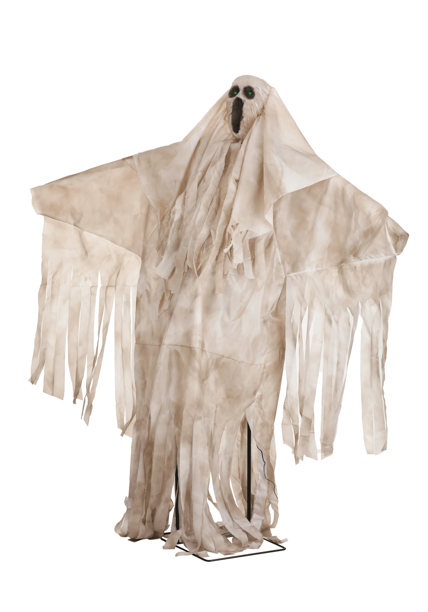 It comes with illustrated instructions on how to assemble the support poles and body into it’s six-foot-tall glory. Once assembled, the ghost can be plugged in to a standard US wall outlet. An indoor only display, this ghost is ready to make your home the new neighborhood haunt!