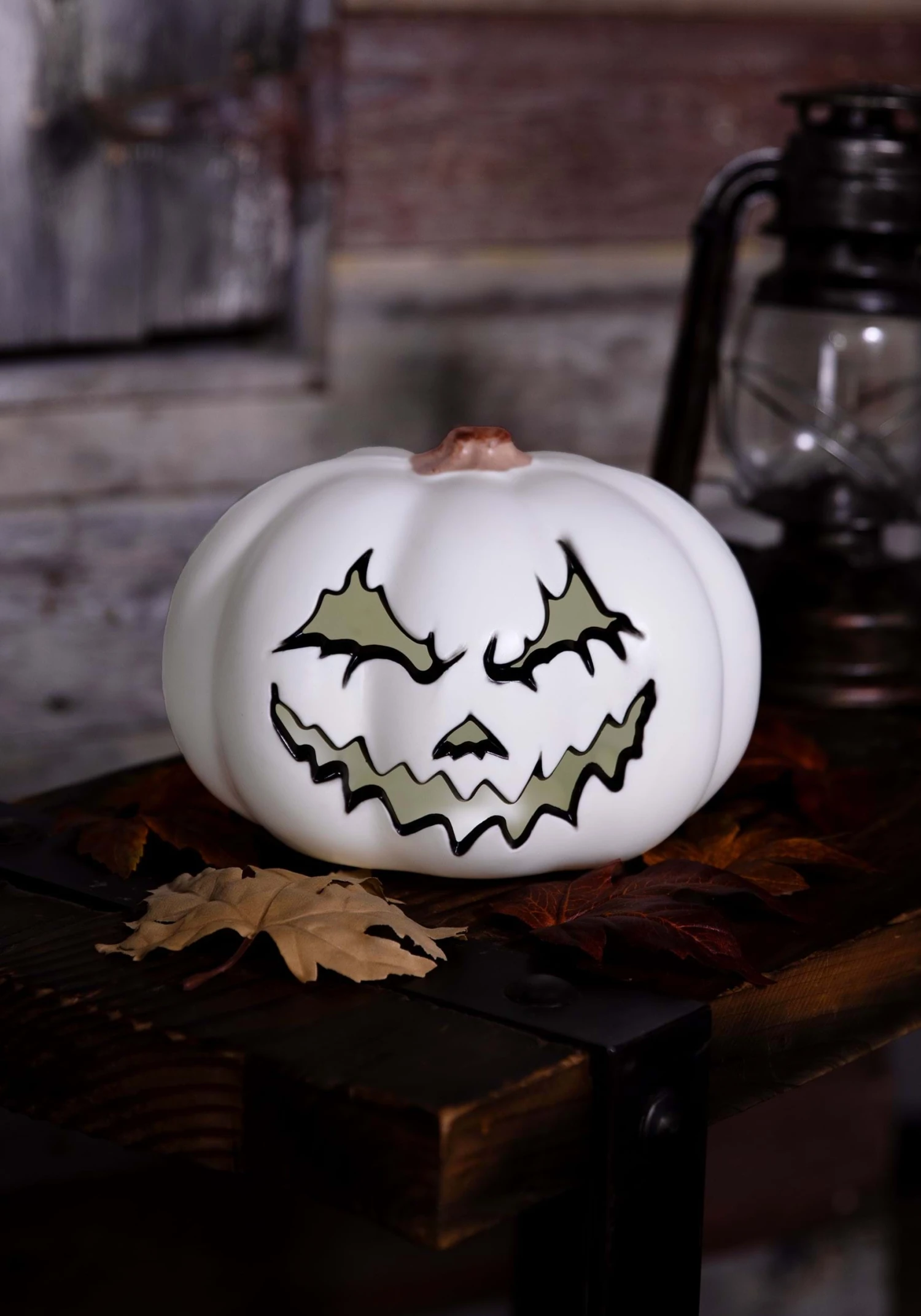 This 9-Inch Spooky Light Up White Pumpkin Halloween Decoration strikes the right balance between spooky and cute! The light orange plastic prop is molded to look like a pumpkin and has a brown “stem” at the top. The front features a creepy cutout pumpkin face outlined in black. When activated, the interior light illuminates the pumpkin’s unsettling grin.