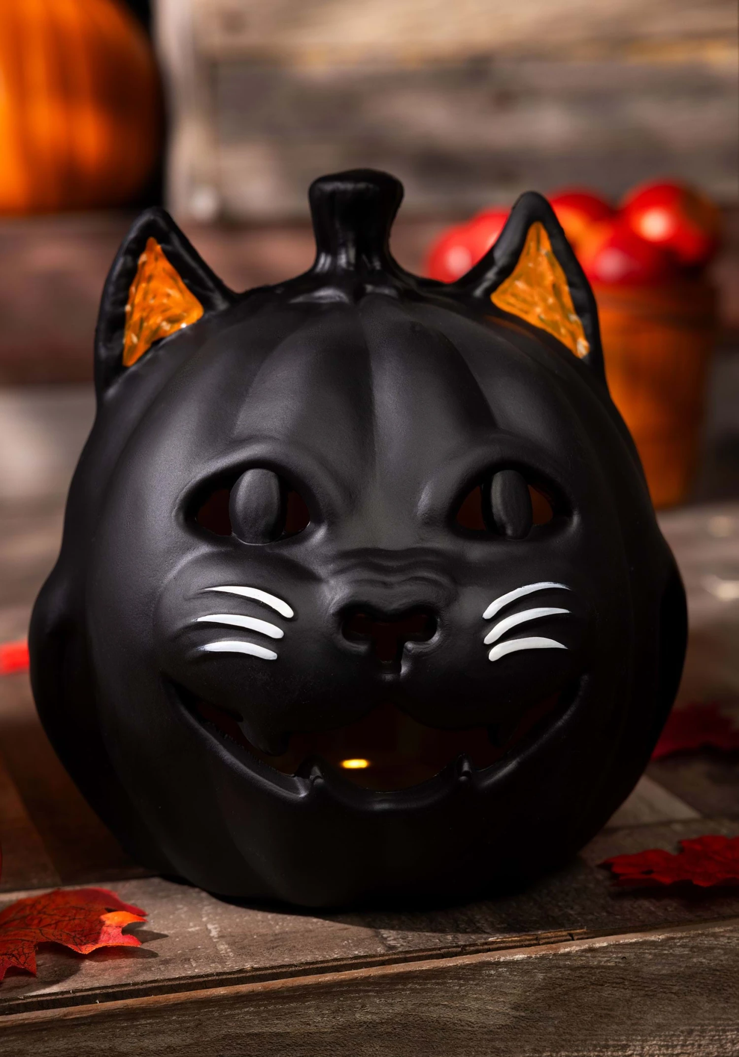 - Black cat jack-o’ lantern has glowing eyes and a light that shines through the mouth
