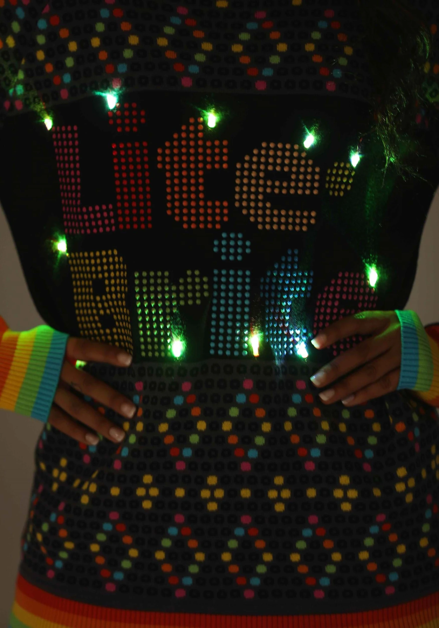 Dress up in this exclusive, officially licensed Adult Hasbro Lite Brite Christmas Sweater whenever you’re feeling nostalgic! The unisex top is made of a blend of acrylic and cotton, while the front panel is lined with polyester. Its black background is decorated with colorful “pegs” knitted into diamond patterns. The Lite Brite title lights up and flashes with althernating colors when the sweater’s battery pack is activated.