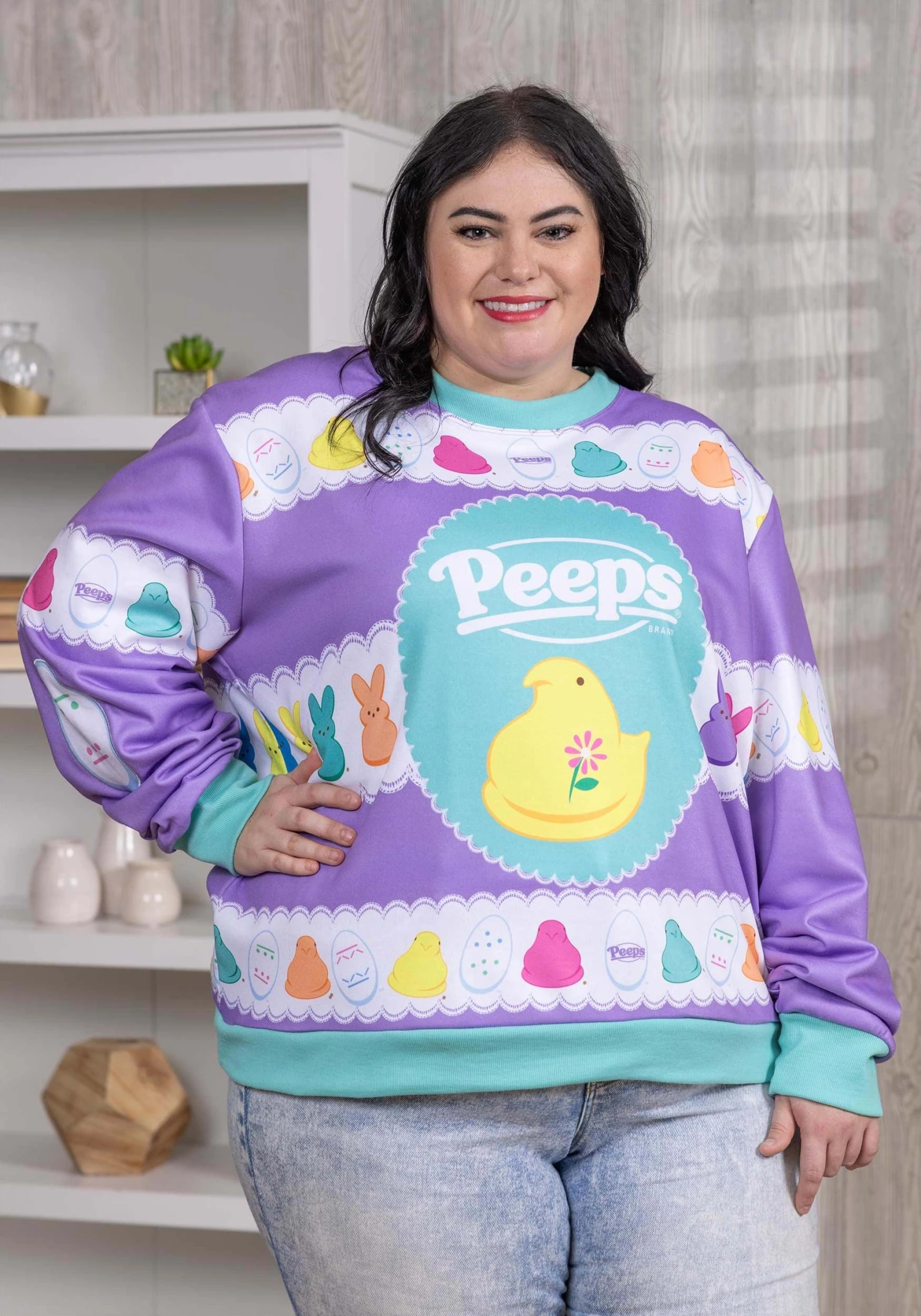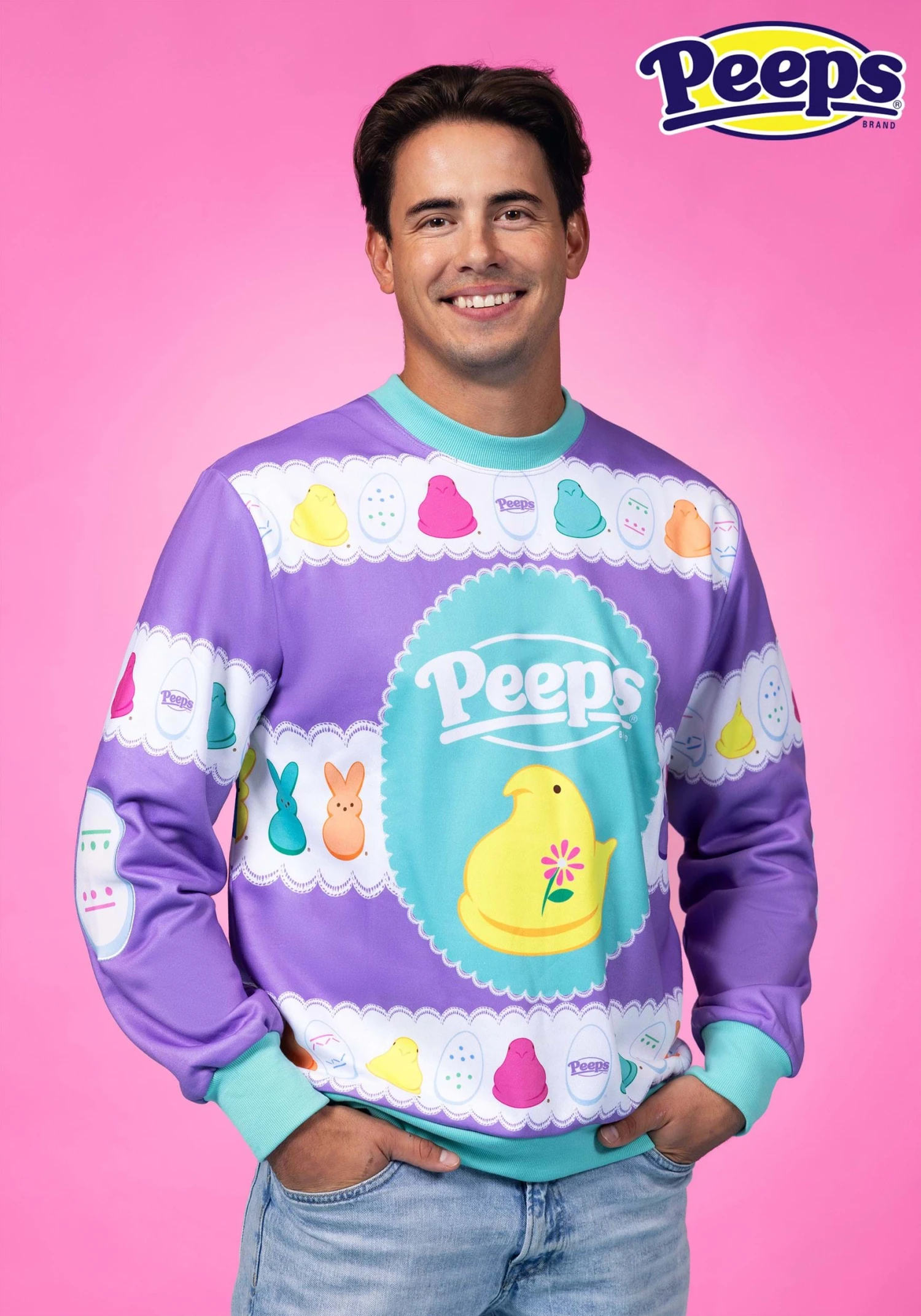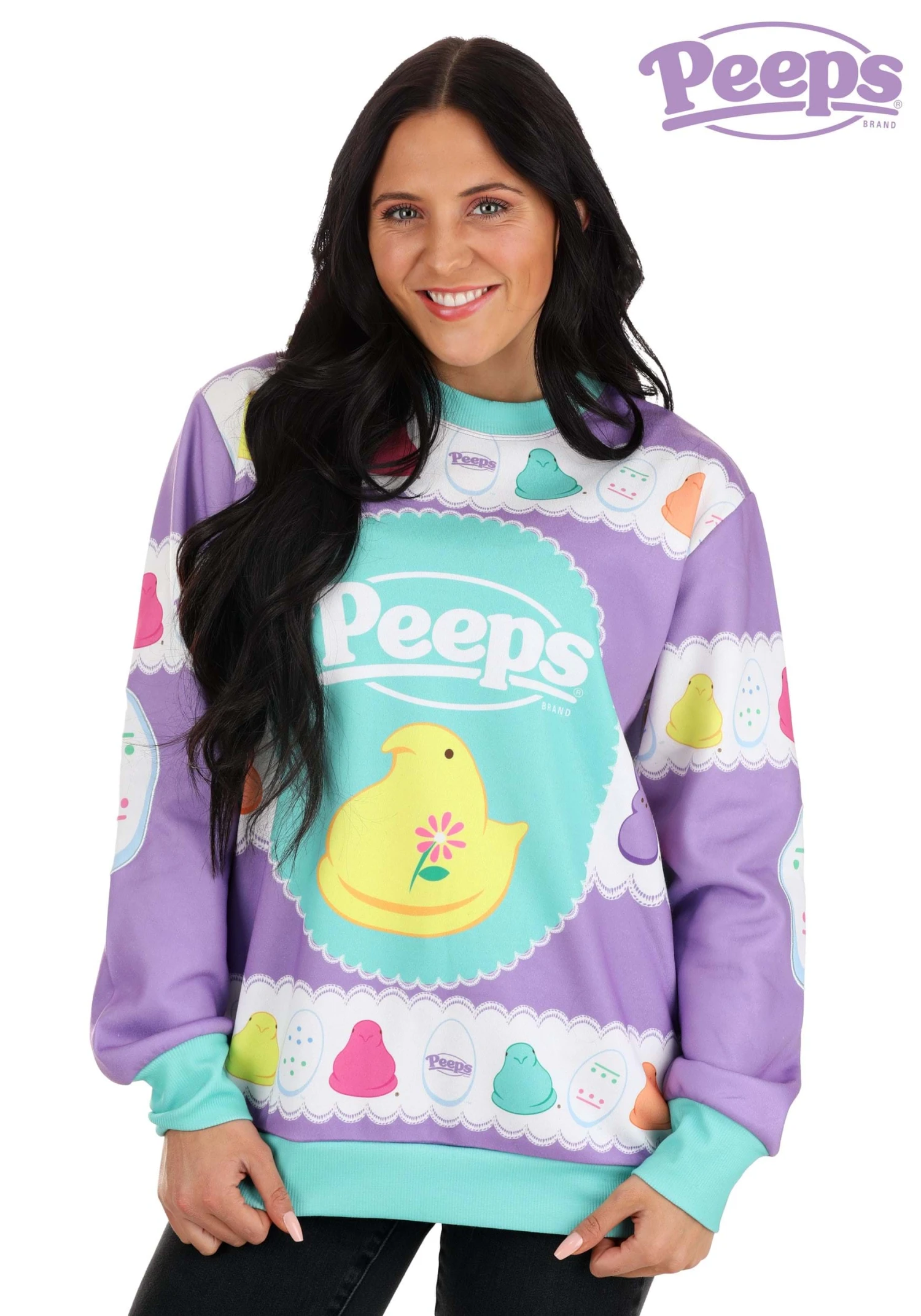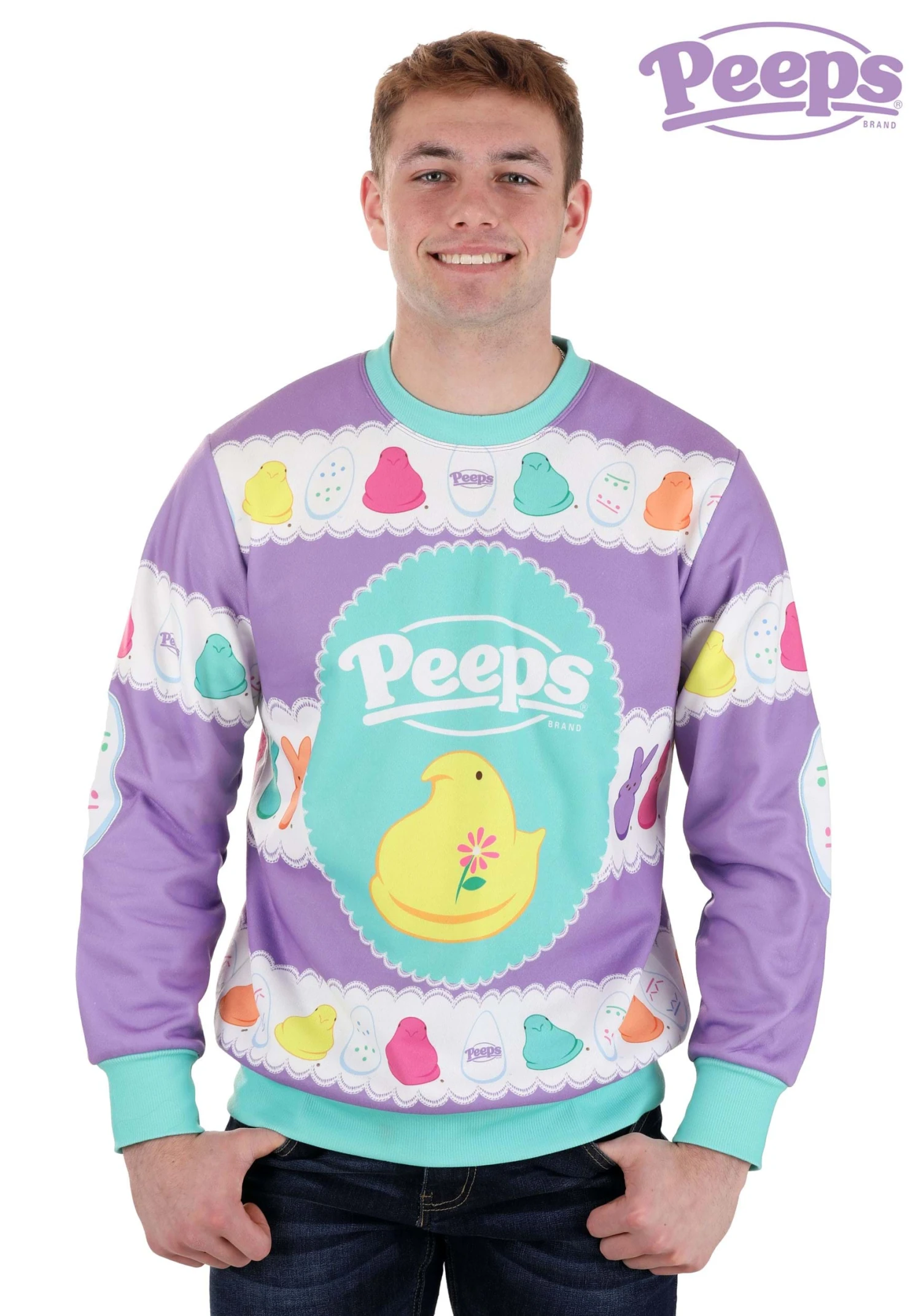 This adorable sweater features tons of pastel colors that help put out the Springtime vibes! The center of the sweater has the Peeps logo on the top, with a large yellow Peep below. The top and bottom have a Peep-inspired pattern with Peeps of various colors! Just toss this on with your favorite pair of jeans and you’ll be ready to bring a colorful new look to your Easter party!