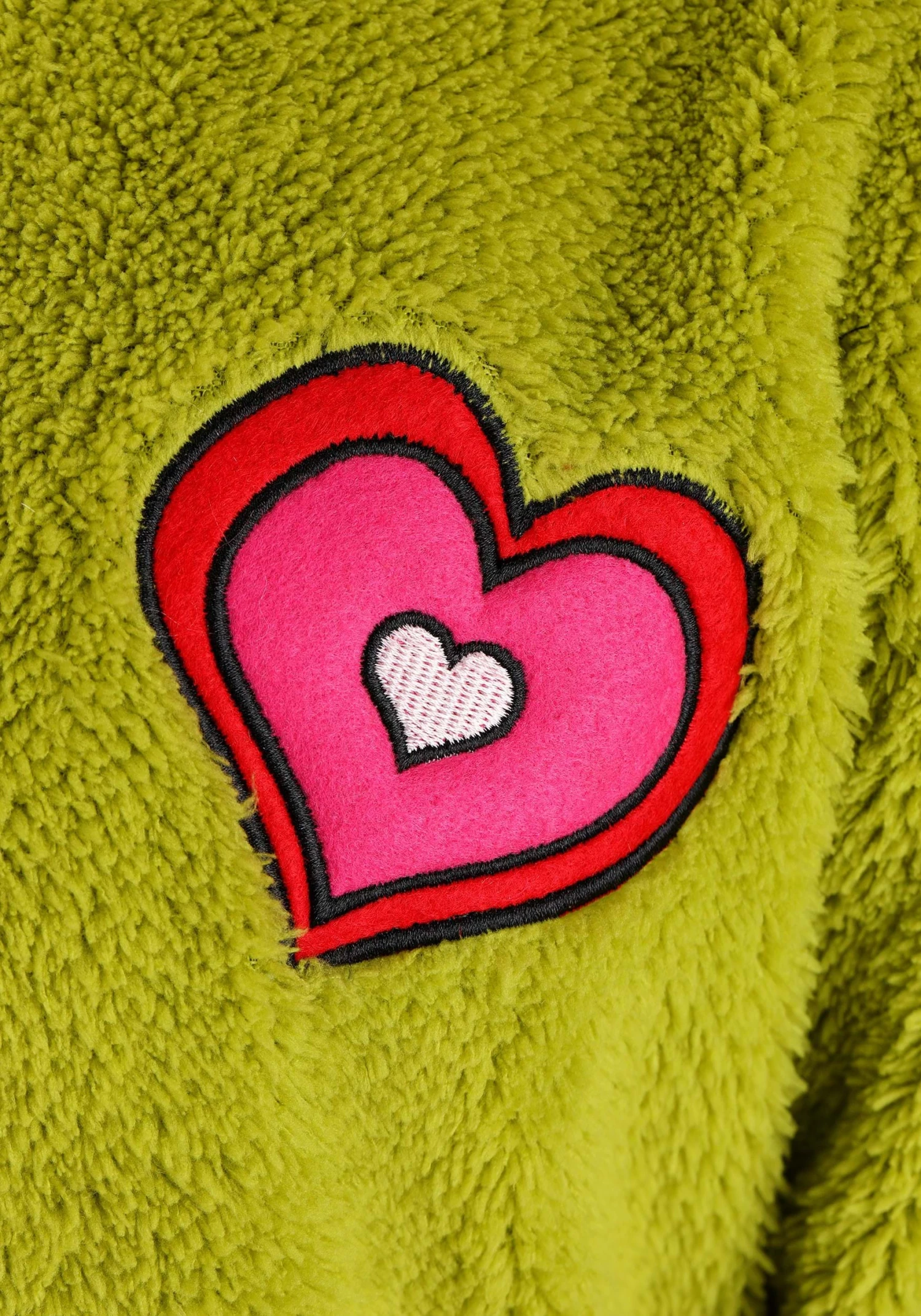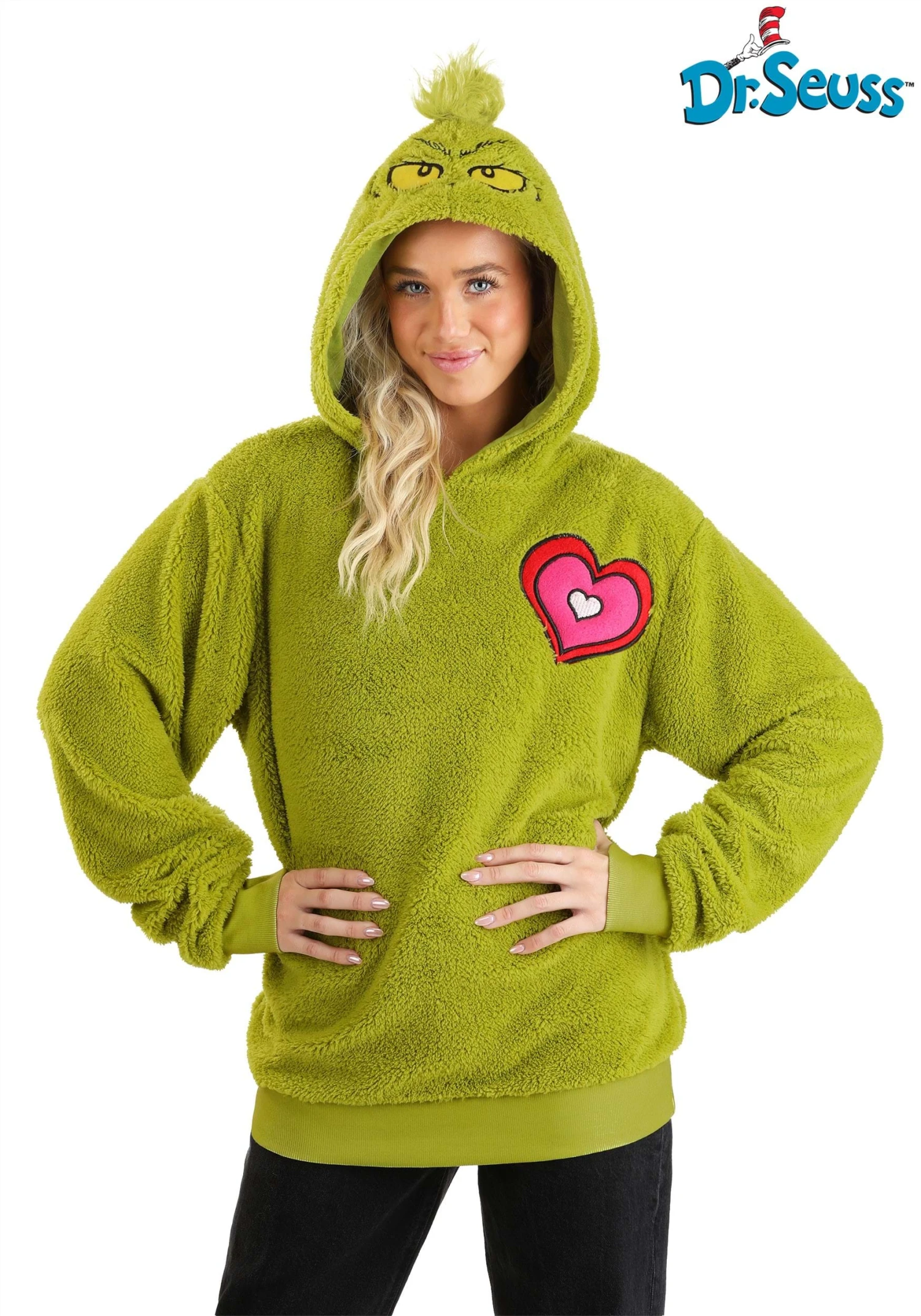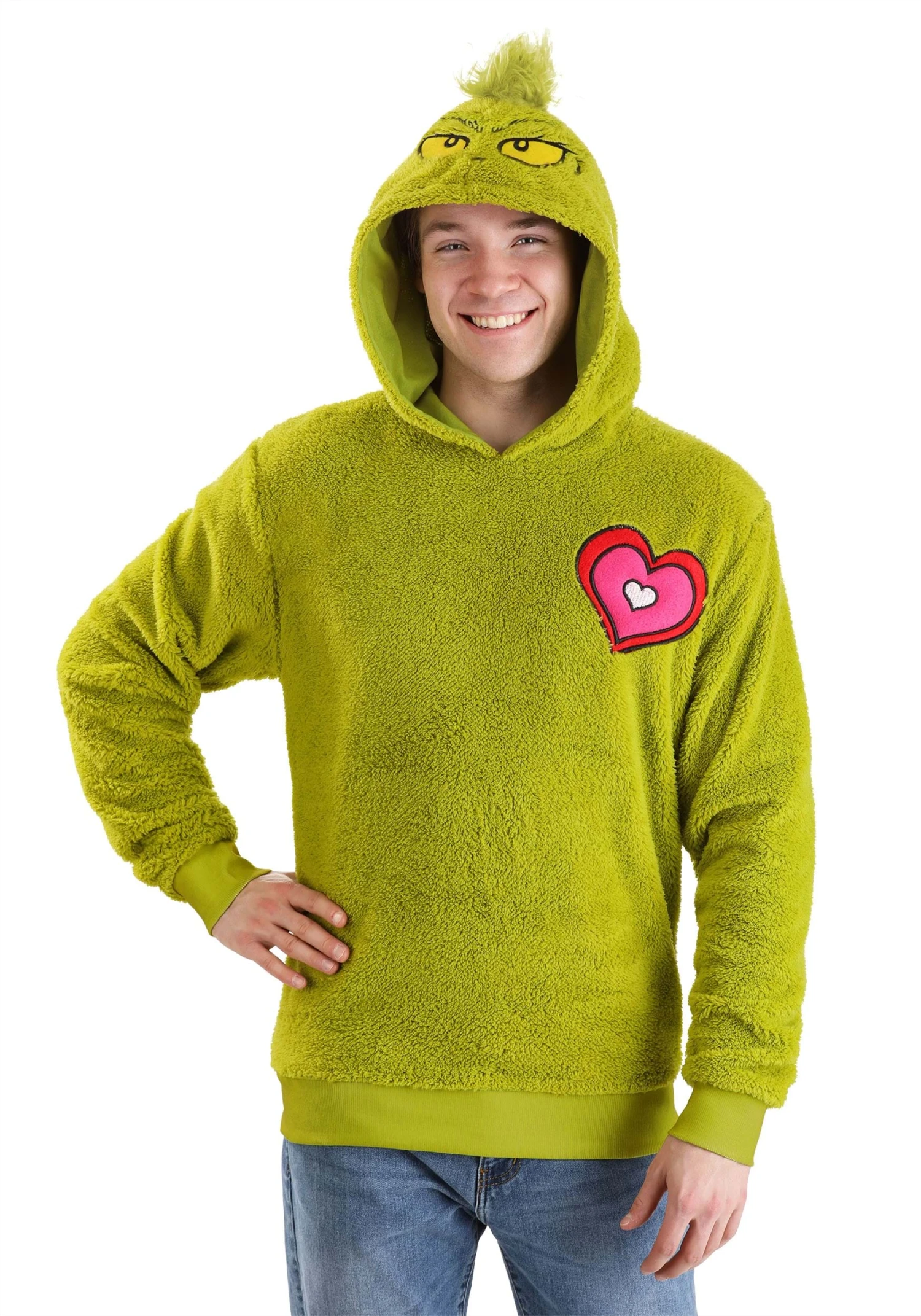 Made from soft, green, shaggy sherpa material, this pullover hoodie is all about peak comfort with a side of festive mischief. The rib-knit cuffs and waistband help keep warmth in—because even the Grinch doesn’t like being cold. Embroidered right on the front is a small red heart, a subtle nod to that unforgettable moment when his heart grew three sizes (which, medically speaking, still concerns us).