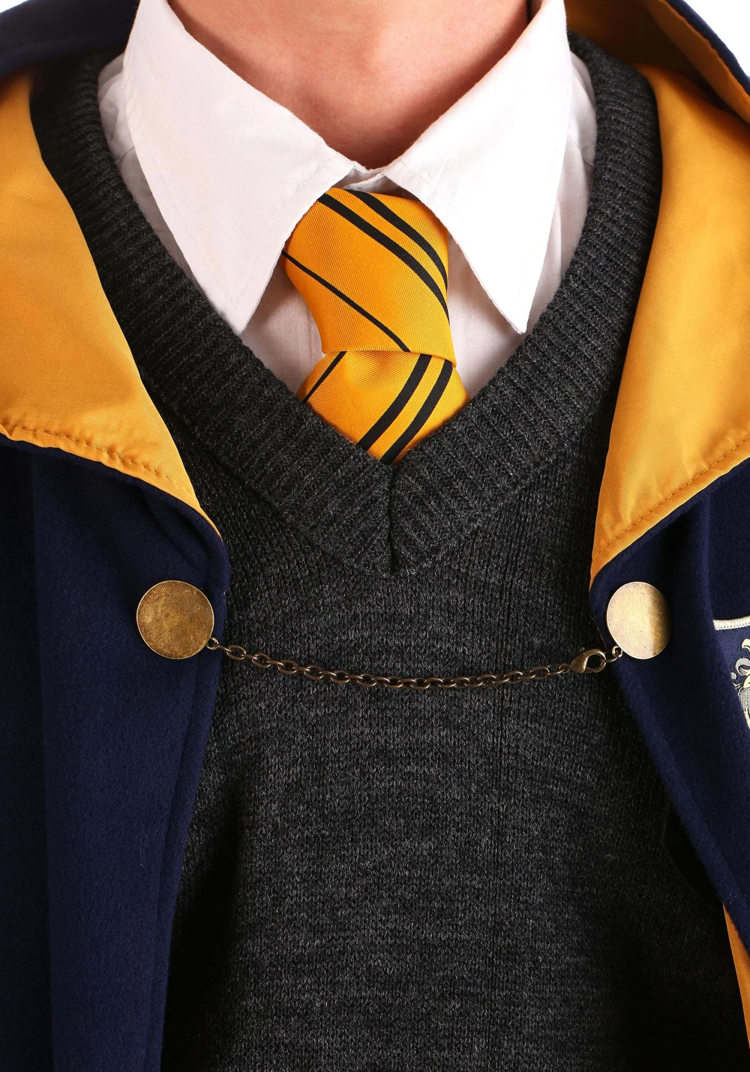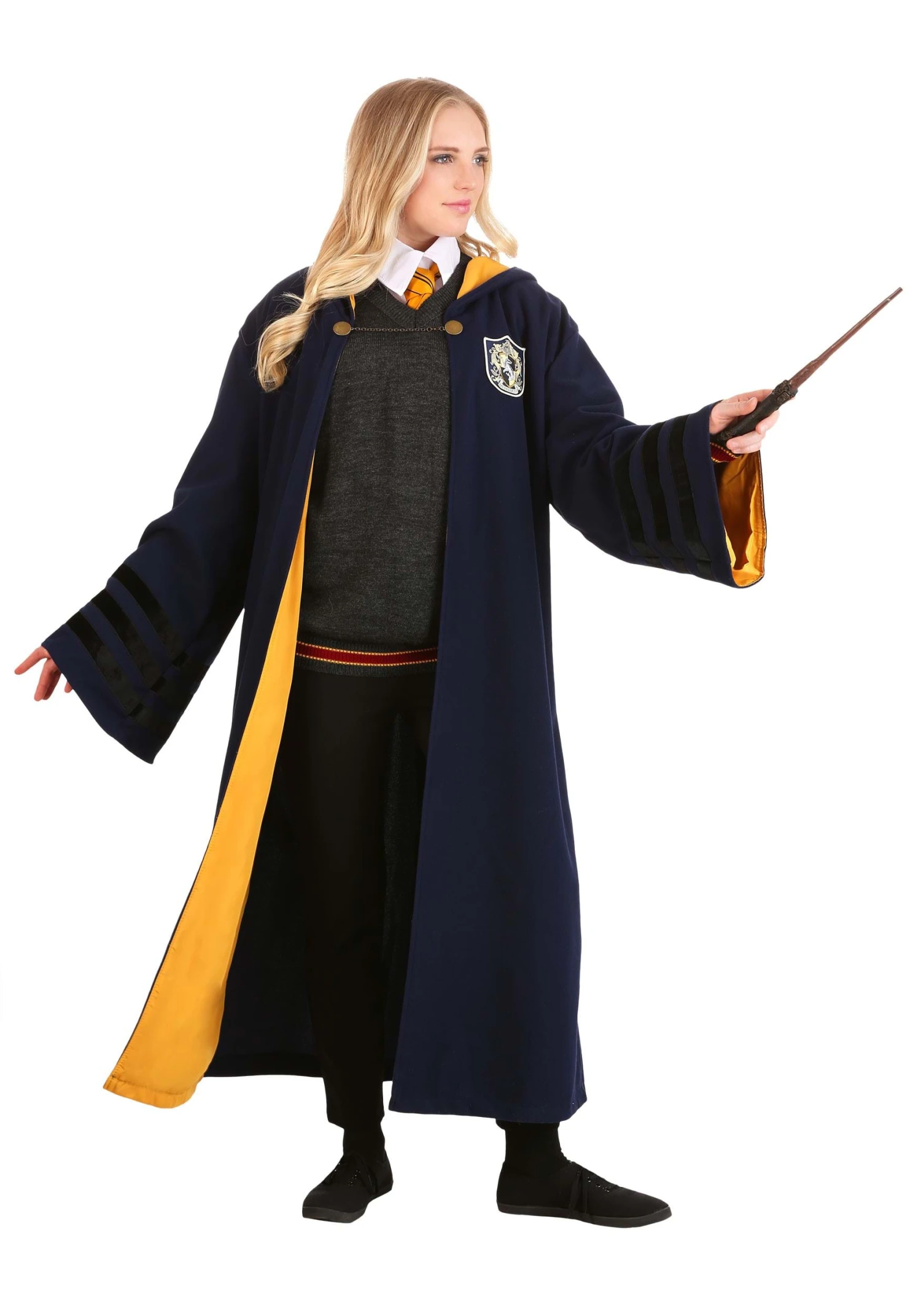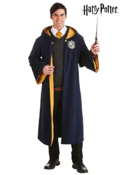 This Vintage Harry Potter Hufflepuff Robe is an officially licensed outfit from the movies. The robe has an astoundingly realistic look and is made from a faux wool, worsted fabric. It fastens in front with a metal chain and clasp. It has the Hufflepuff emblem on the chest and it even has a 10″ pocket for holding a wand. It has flared sleeves and appliqued velvet strips for added realism. Of course, no wizard robe is complete without a robe and this one comes with a fully lined one that has the golden Hufflepuff House color. Just toss it on and you’ll be ready to begin your schooling at the famous wizarding school.
