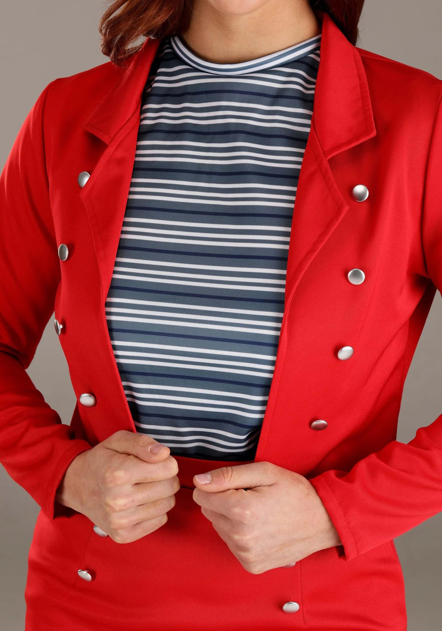 - Non stretch woven suiting fabric jacket is open in the front, decorative silver values down each side