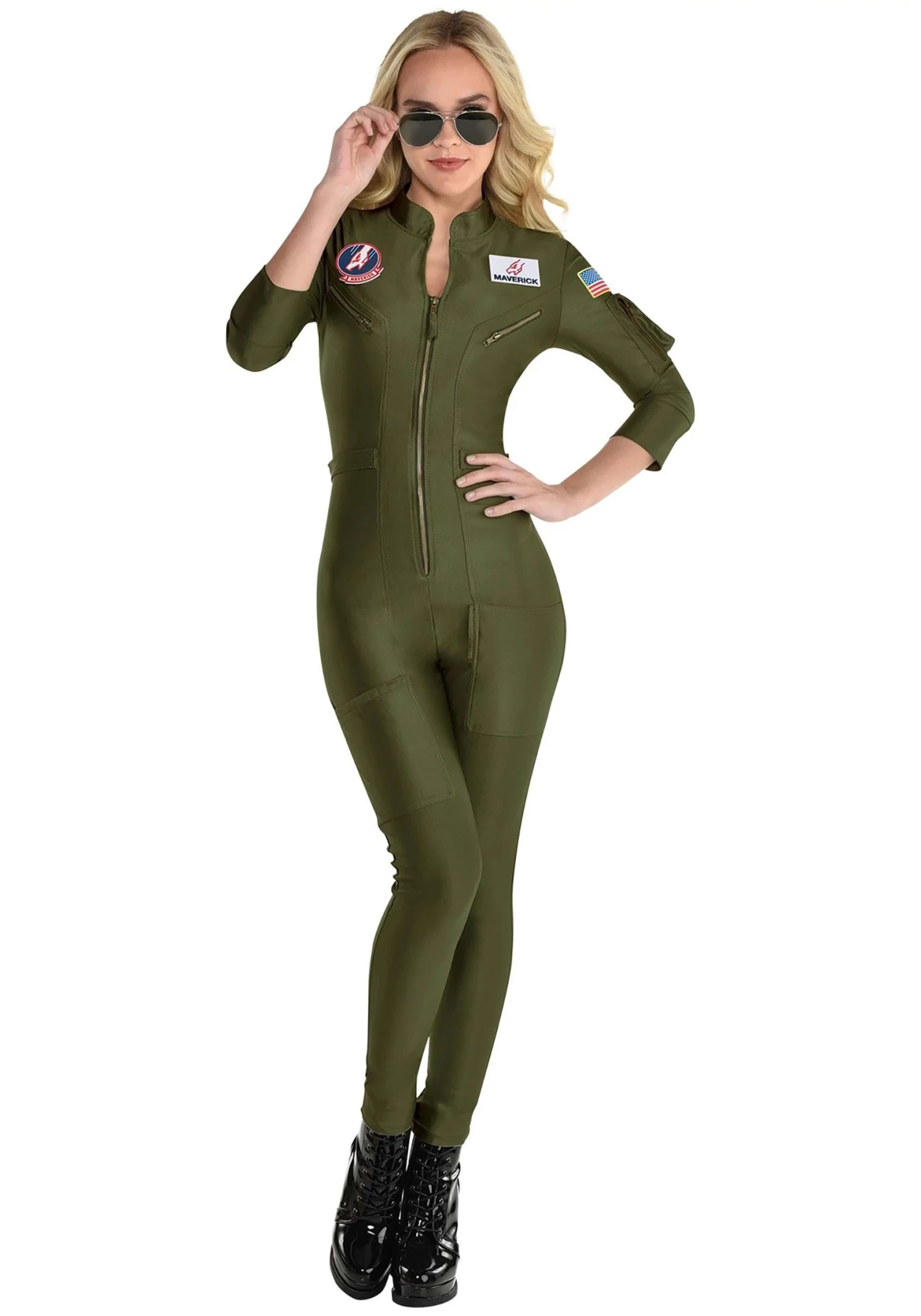 This officially licensed Top Gun 2 Flight Suit Costume for Women is hotter than a game of beach volleyball! The green jumpsuit is made of a form-fitting olive green stretch knit fabric. Its front zipper allows you to customize the depth of the outfit’s V-neckline. False pockets are sewn to the chest and the left sleeve. Each leg features a functional patch pocket. The four interchangeable printed patches can be removed and attached via hook and loop fasteners. A printed patch is sewn to each sleeve.