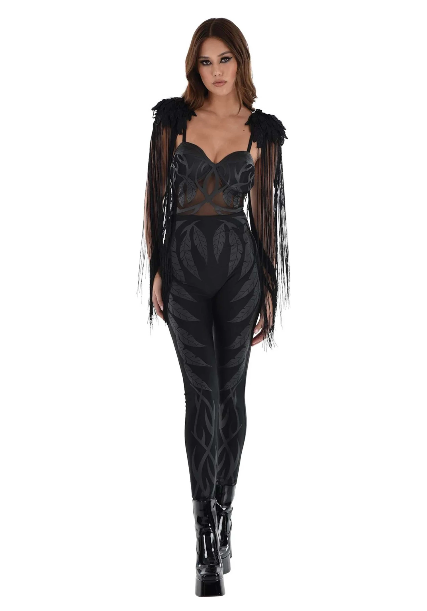 The costume includes a striking black catsuit made from a spandex and polyester blend that hugs your shape with a flattering stretch. The top features delicate spaghetti straps adorned with soft feather accents, adding a touch of dark elegance to the neckline. Across the sheer upper section and legs, you’ll find a series of artful black feather designs, giving the illusion that you’re wrapped in shadows and style.