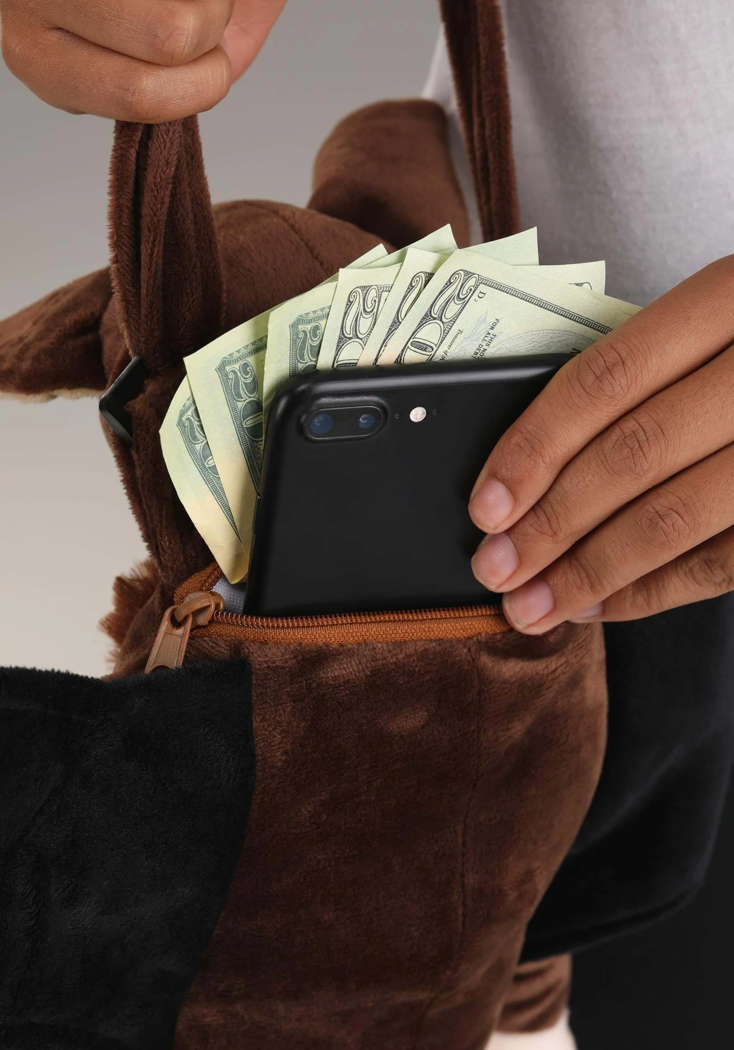 - Zipper on the back opens to a small compartment to hold a small wallet or keys