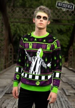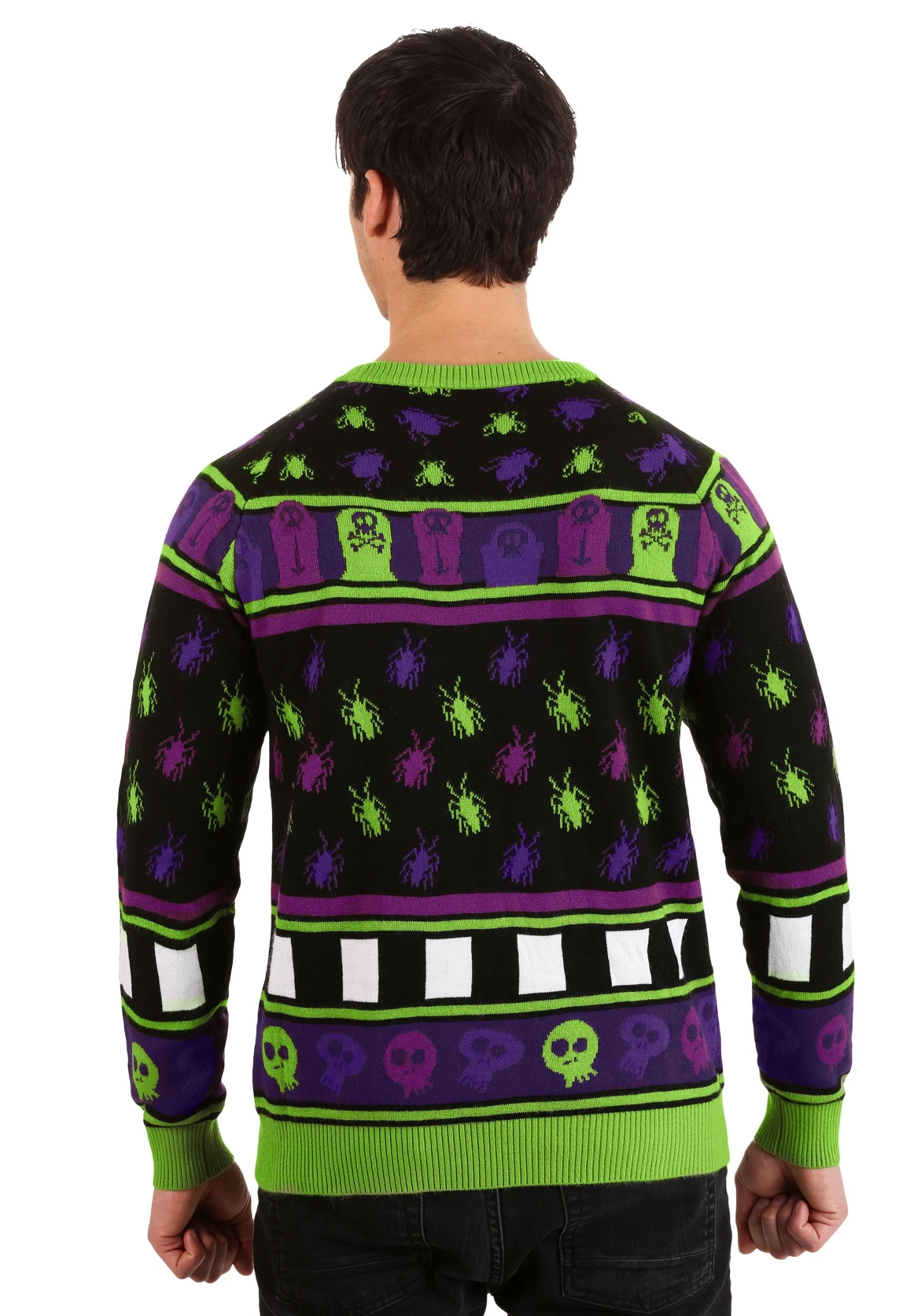 This officially licensed sweater is just one of our many sweaters in our Halloween sweater line! It combines the freaky style of Beetlejuice with the cozy fit of a Fall sweater. It’s made completely out of acrylic, which makes it a comfortable choice for chilly, fall weather. The front has a knit-in graphic of Beetlejuice, the man himself! It also has repeating patterns of skulls, gravestones, and bugs to help give it that fresh-from-the-grave sort of vibe. Finally, the rib-knit cuffs and the raglan sleeves help give this sweater a cozy fit as the cool Halloween weather starts to approach. Whether you’re a Tim Burton fan, or you just want to skip the costume for something a little comfier this year, this sweater is the right choice!