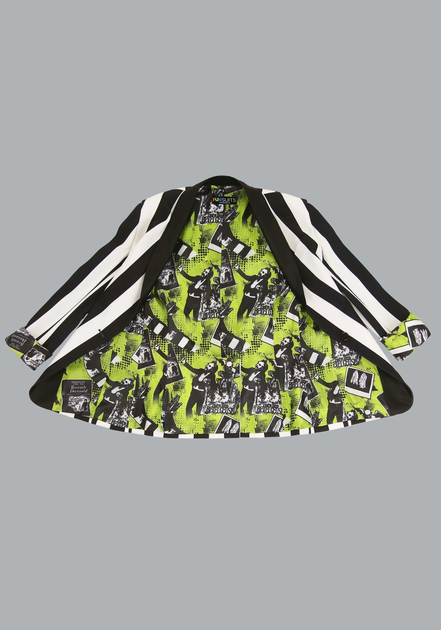 Working some creepy chic touches into your workweek wardrobe is a whole lot of fun with this Beetlejuice blazer. The relaxed fit and shawl collar pairs easily with a variety of clothing from dressy to casual. Pairing the striped jacket with the Beetlejuice suit pants is a look that can’t be beat.