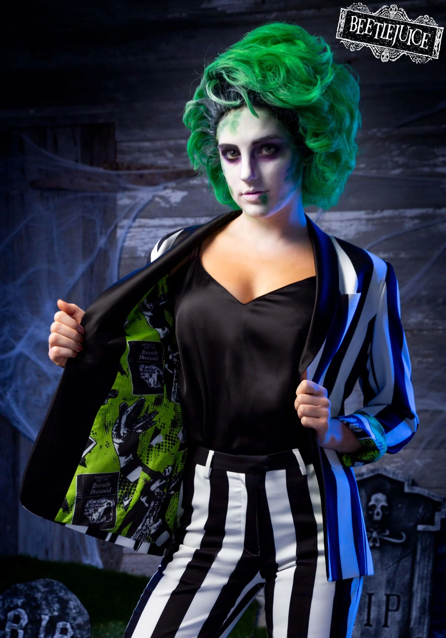 Lined with an eerie green that’s patterned with illustrated images from the movie such as sandworms, Beetlejuice himself, and the Handbook for the Recently Deceased, this jacket is definitely not ordinary in any sense of the word. Slipping into this unique jacket will bring your Halloween look from the boardroom to a ghoulish get-together at a moment’s notice!