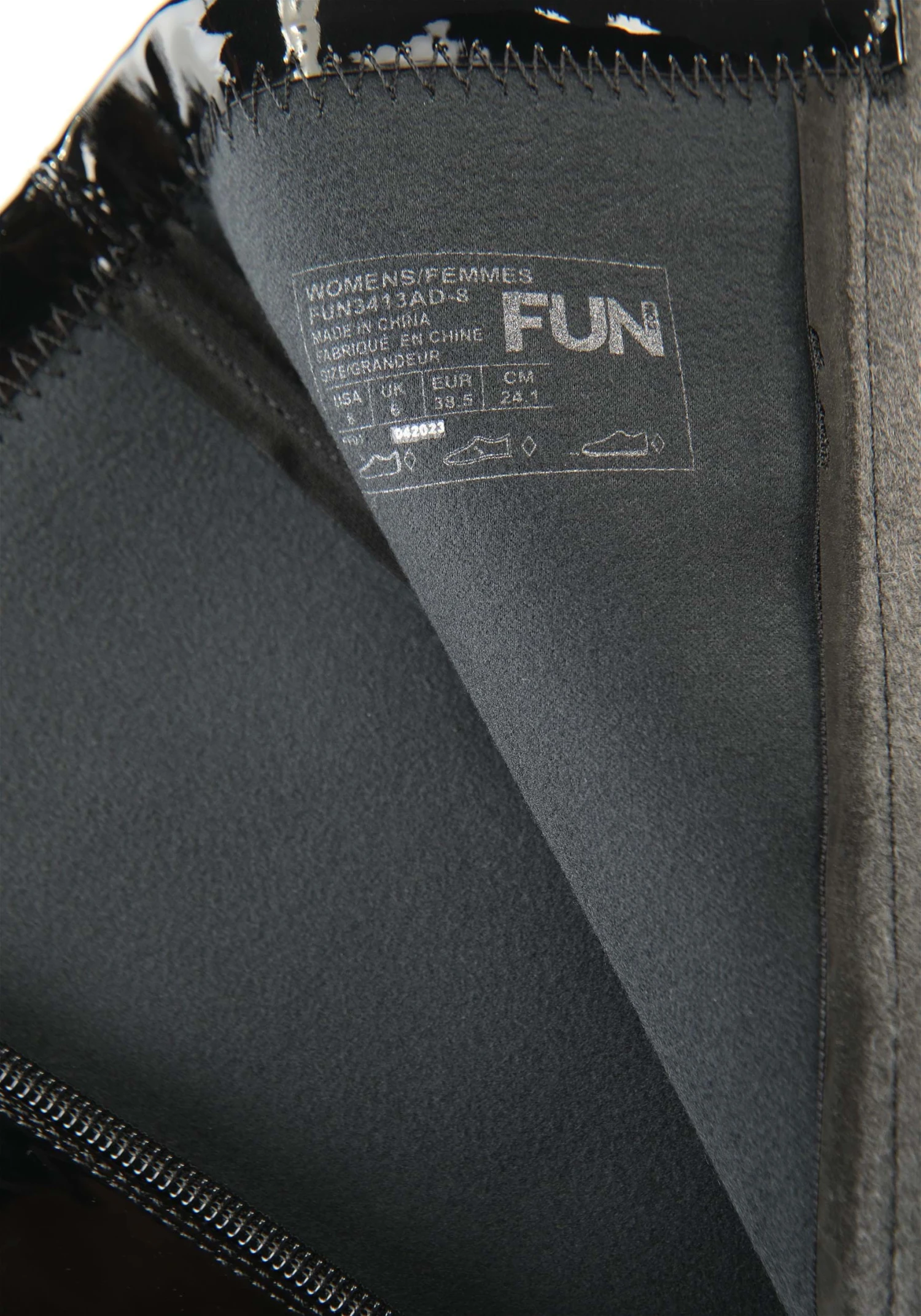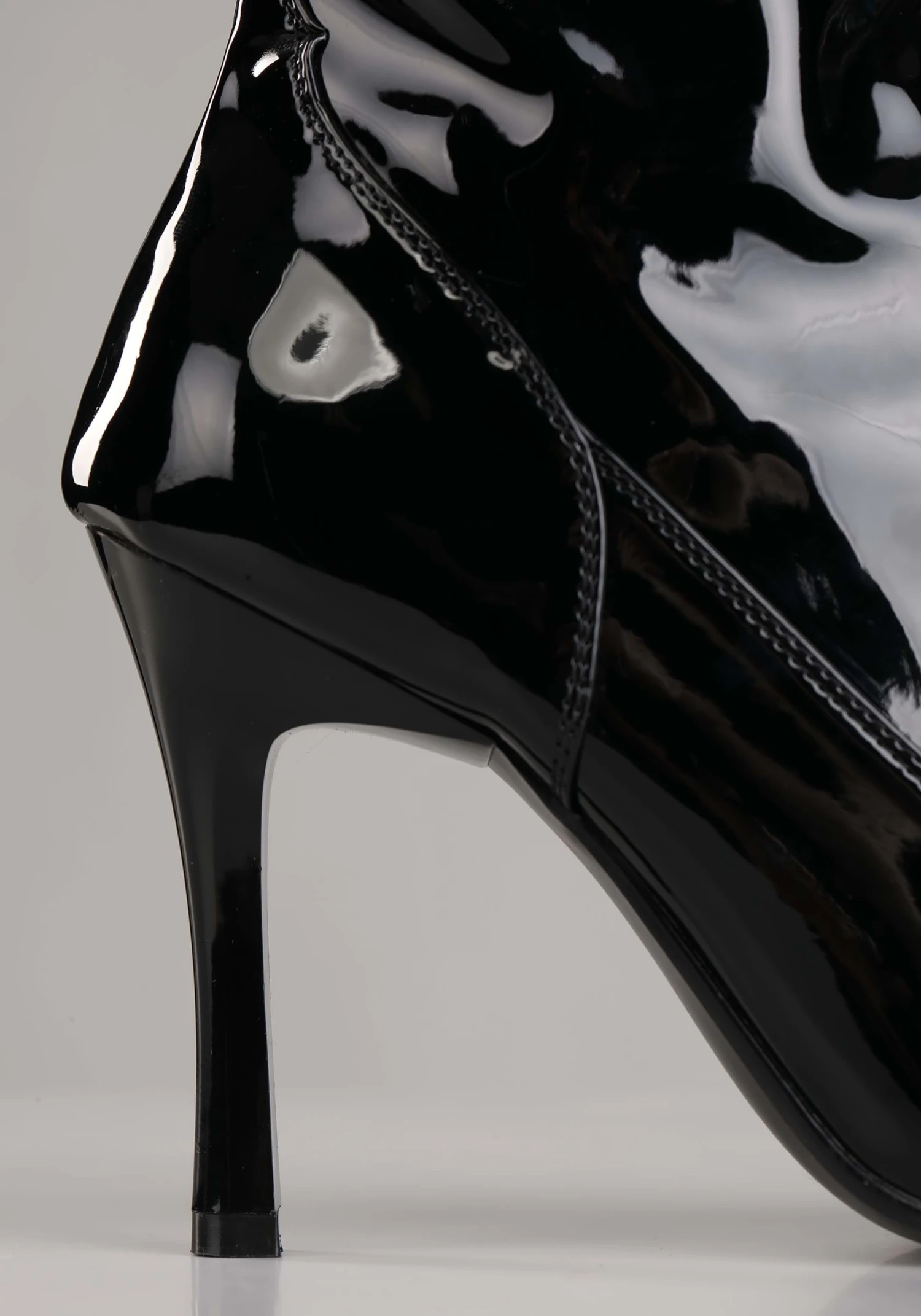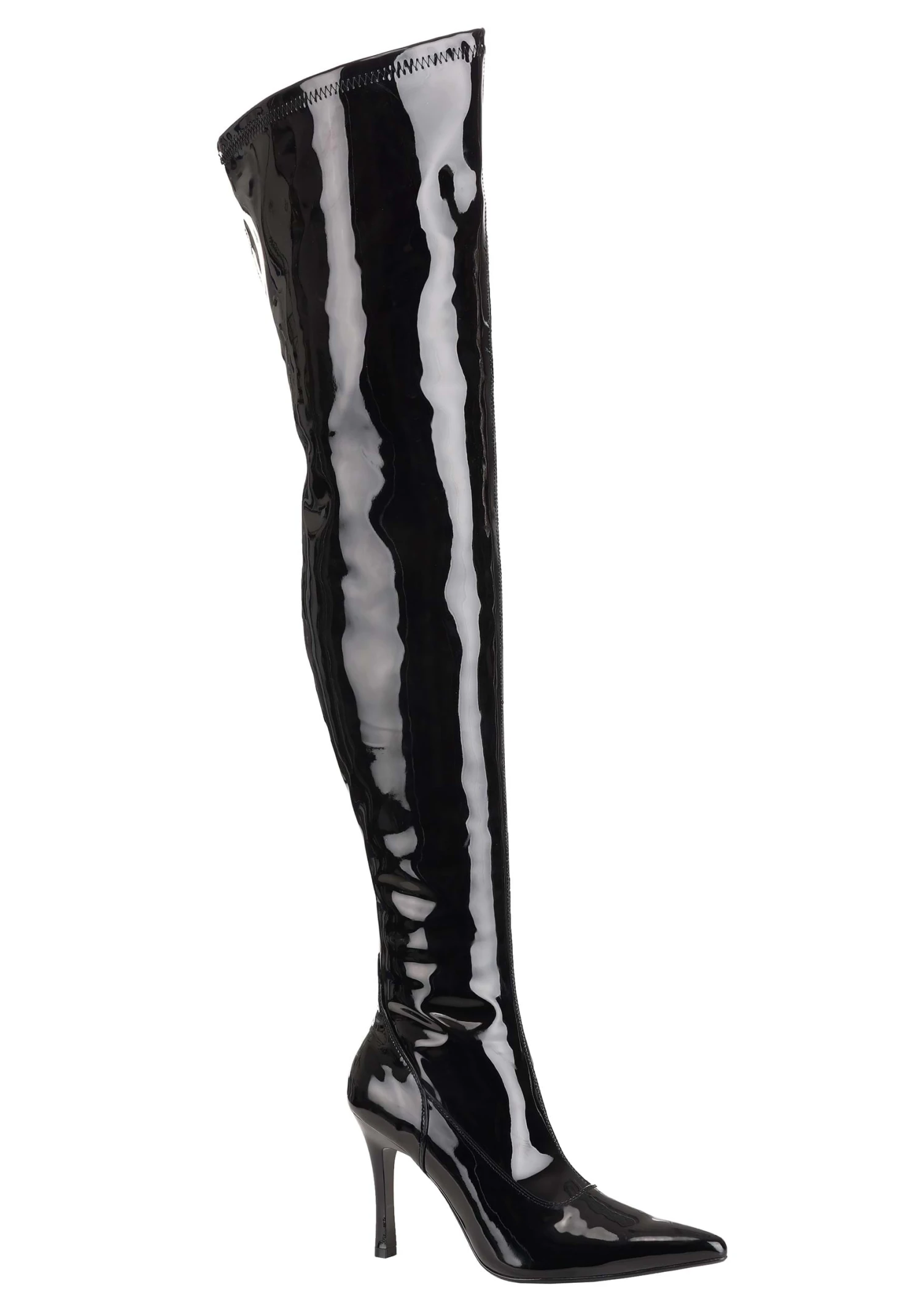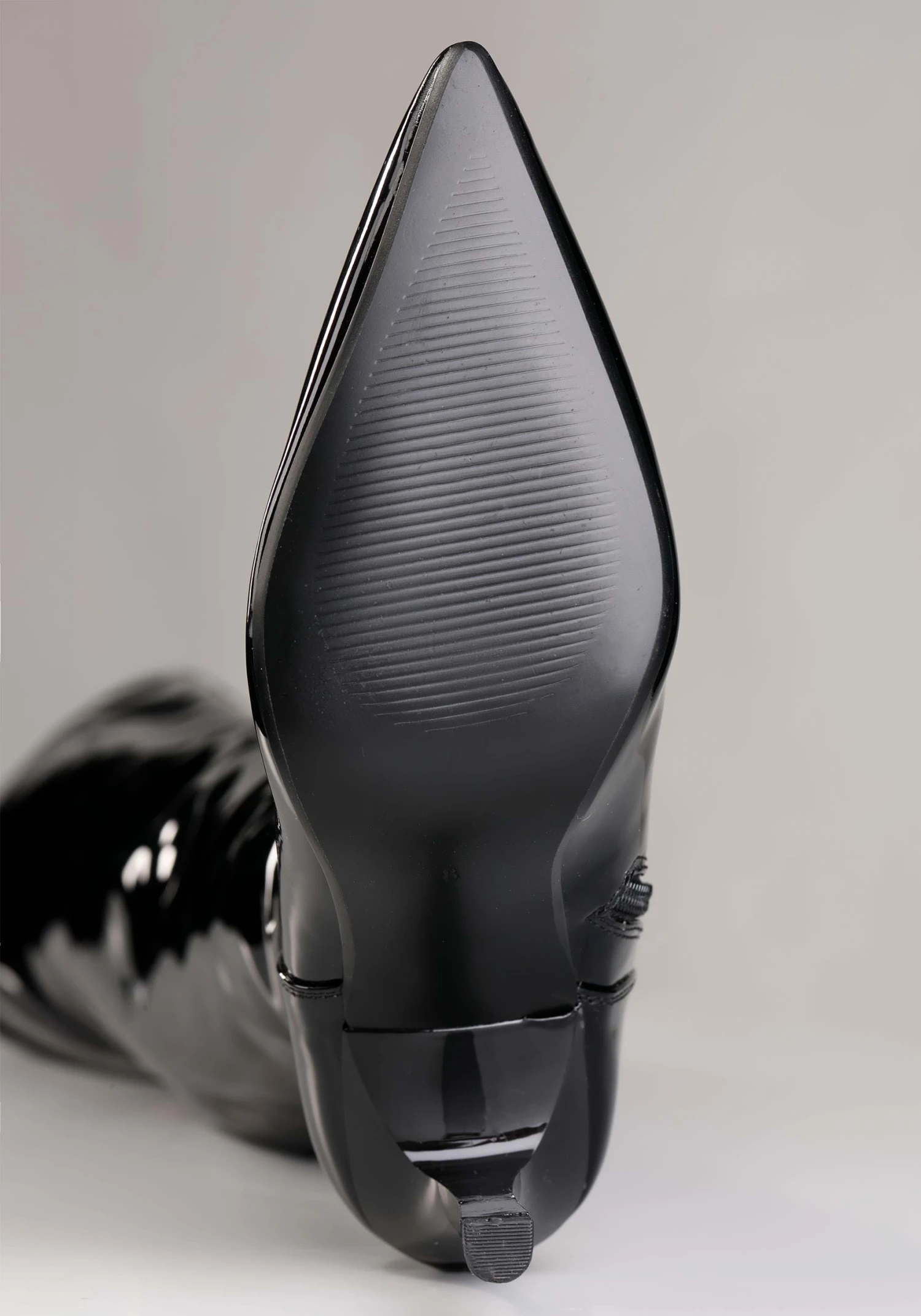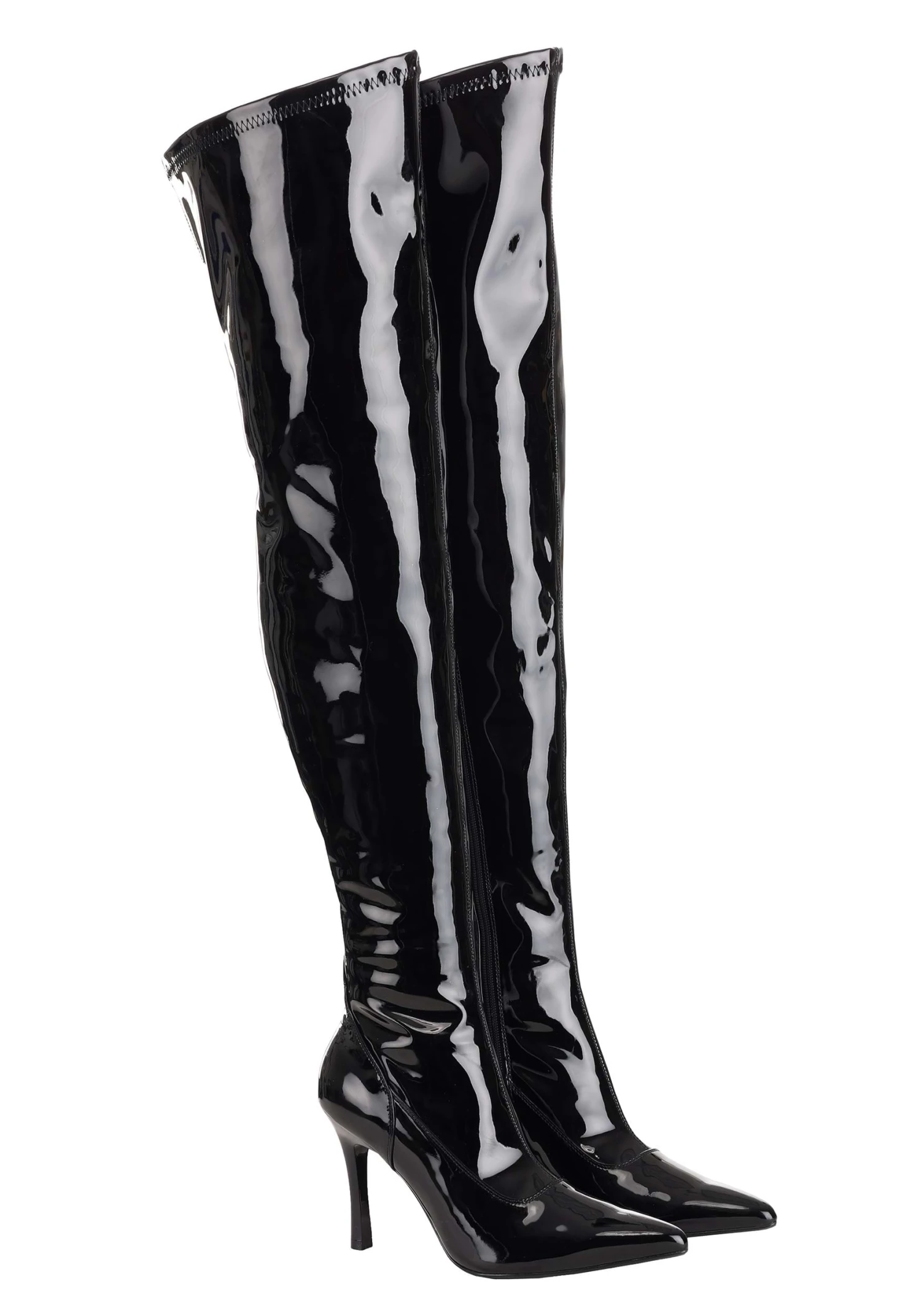 Step out in style with these exclusively designed Black Patent Over the Knee Boots for Women! The shiny black faux patent leather will accent your amazing legs as you go your merry way. A zipper down the inside of the boot ensures that you can get them on and off easily and quickly, and the stiletto-style heel adds a little extra touch of sexiness.