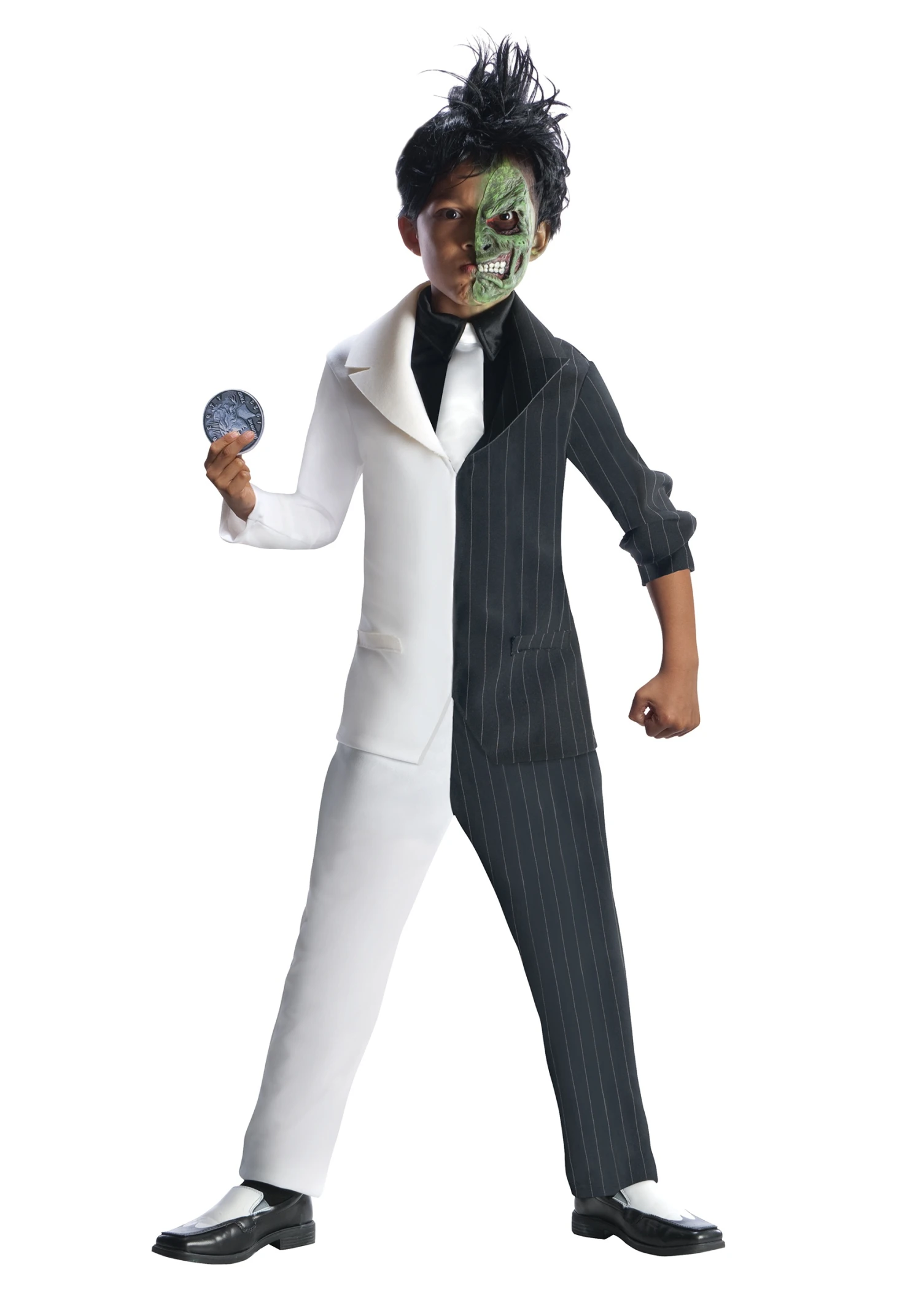 This Boys Two-Face Costume is for the boy who spends his time concocting villainous schemes and kids who have a strange penchant for flipping coins. This costume is officially licensed from the Batman series and is made of 100% polyester for a comfortable, breathable fit. The shirt is a one-piece garment with the tie, jacket, and faux pockets – it attaches with a Hook and Loop fastener closure in the back. Also included are the matching pants. The costume also comes with the classic ½ face mask and, to complete the look, a printed, foam, two-sided coin. No true Batman group costume would be complete without this two-faced villain!