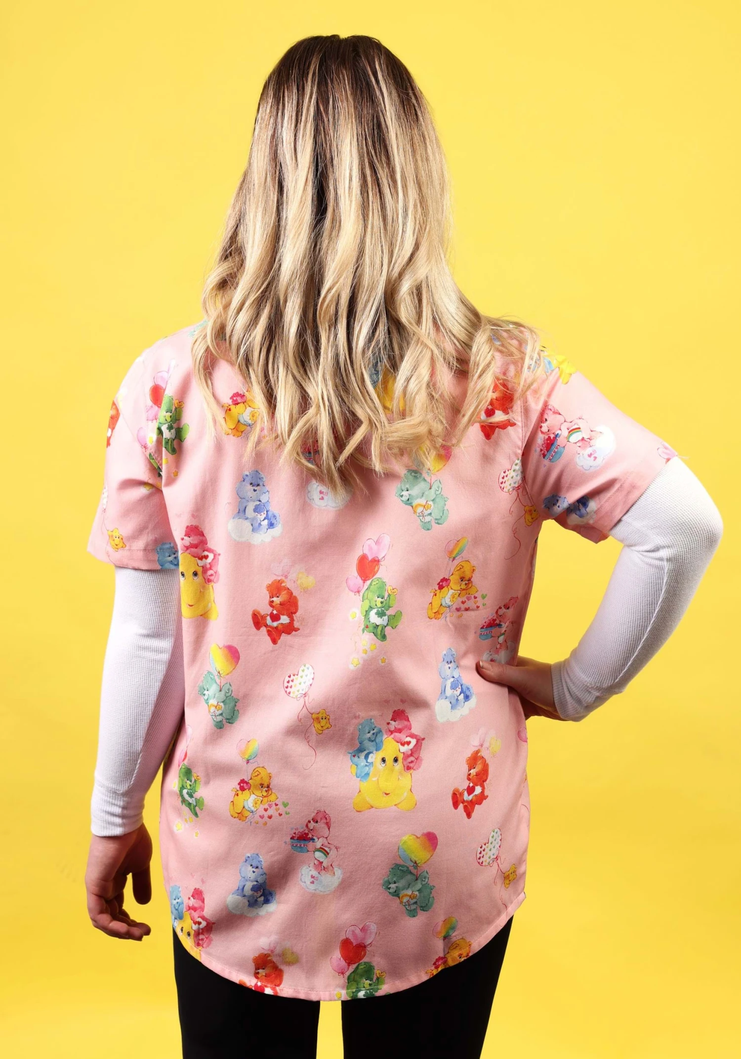 This is an Adult Cakeworthy Care Bears Camp Collar Button Up Shirt.