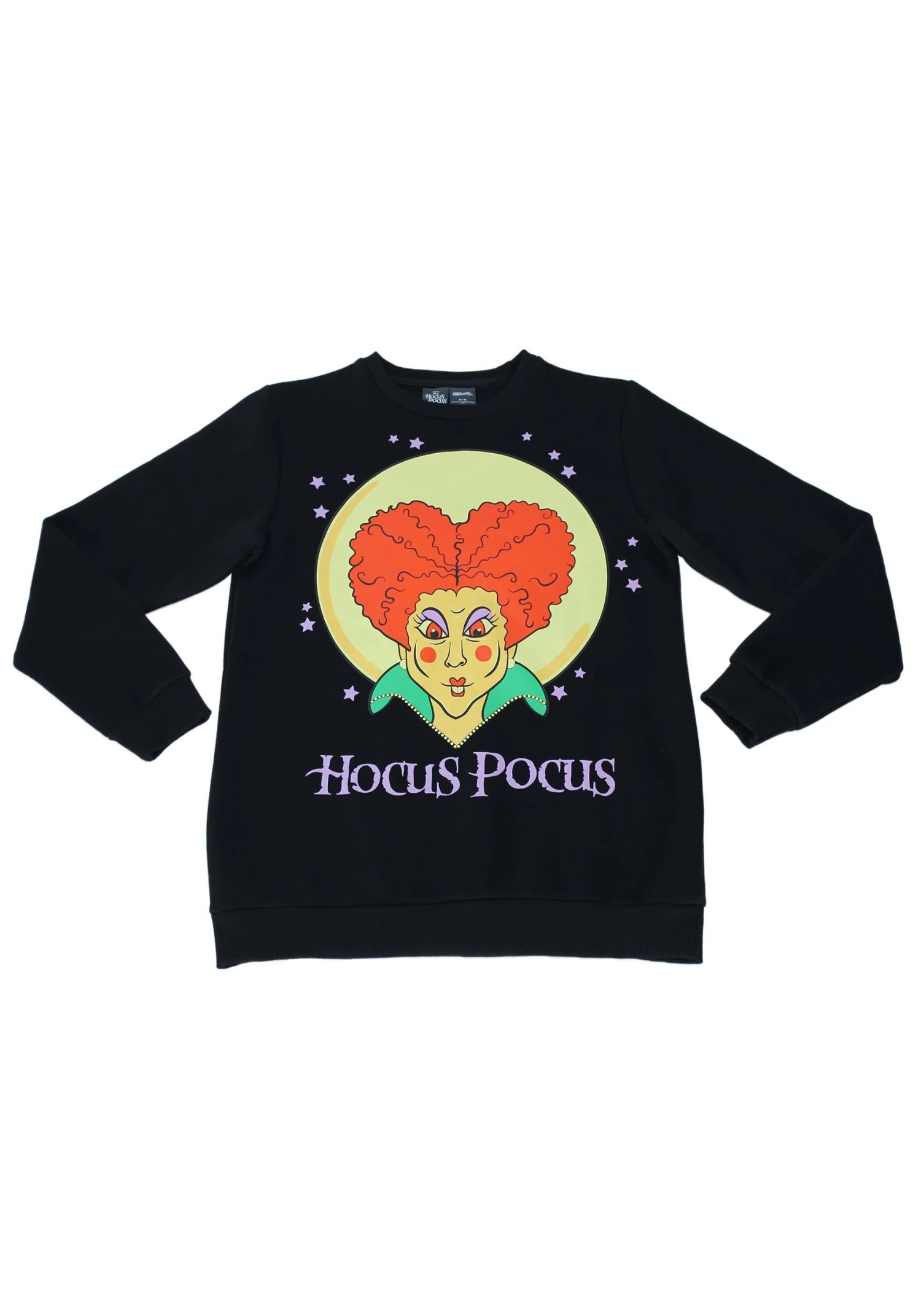 You don’t need any magic spells to get your hands on this officially licensed Cakeworthy Winifred Sanderson Pullover Halloween Sweater! The soft polyester-cotton blend fabric is printed with Winifred’s face on a background with a full moon and stars. “Hocus Pocus” is printed underneath.