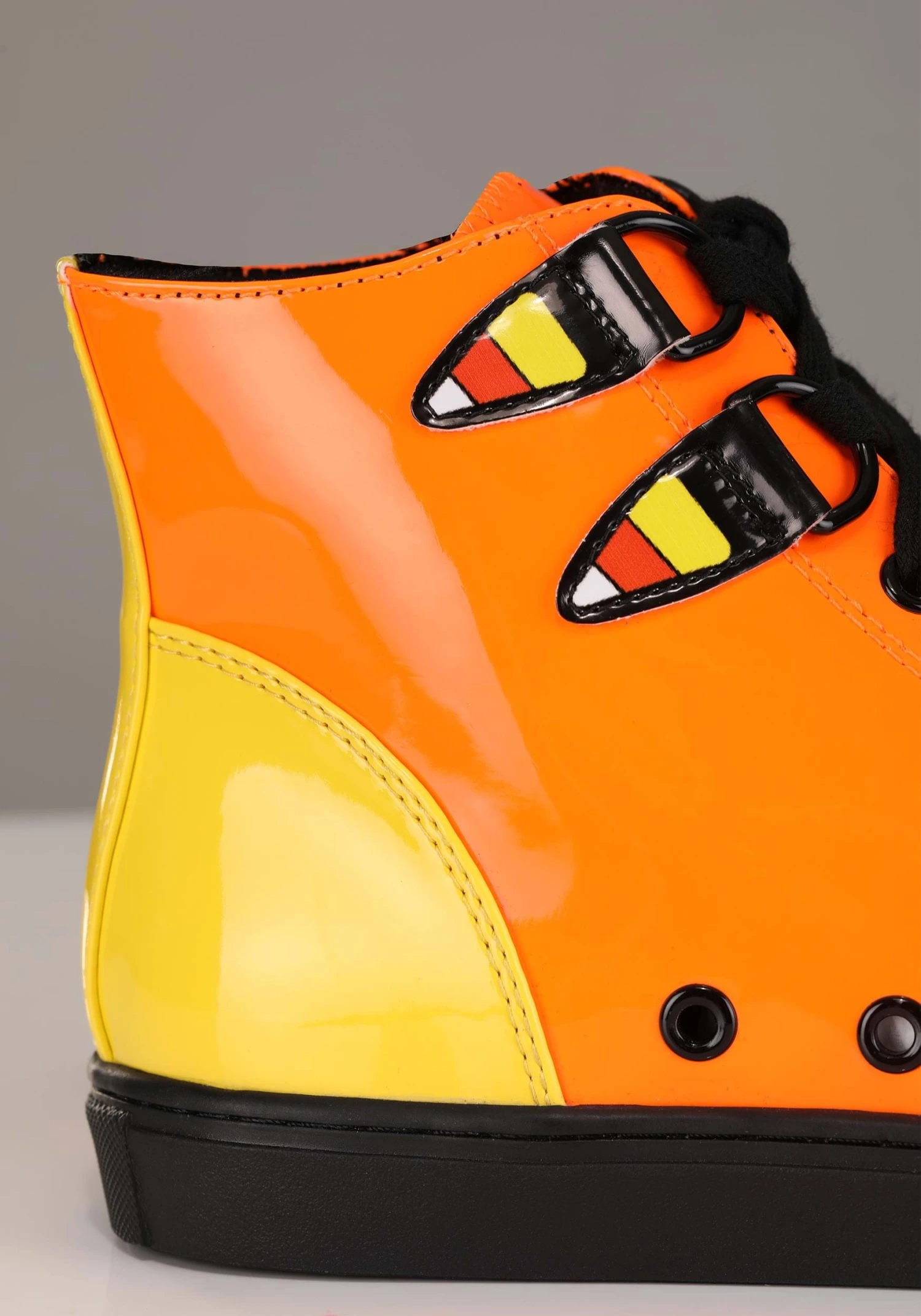 This is a pair of Chelsea Patent Leather Candy Corn High Top Sneakers.