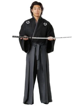 Step back into an age of art and intrigue thanks to the work of our in-house artisans. They’ve crafted this exclusive Classic Kimono Set to help you become the samurai you were always meant to be. The pants of this set are a gray trouser with wide pleated legs and a wrap belt that you may tie or leave hanging loose. The top is a wrap kimono of black poly blend and gray trim along the neckline and wide sleeves. Embroidery on the chest reveals a samurai symbol inspired by the Mori clan, though you can pledge yourself to any daimyo you like… or become a ronin drifter!