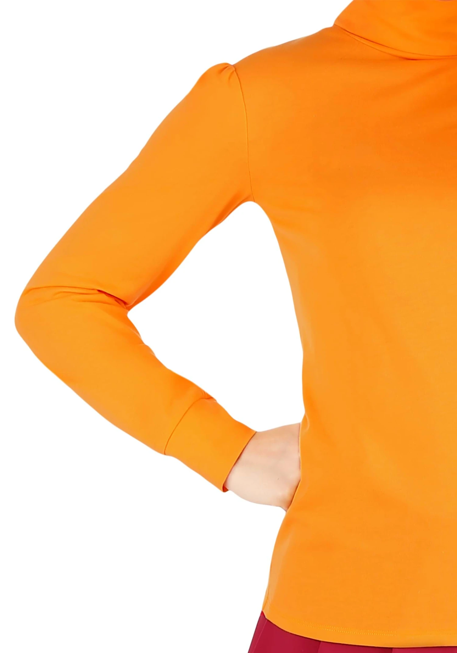 This women’s Velma Dinkley costume brings you everything you need to transform into the problem-solving bookworm! The pullover turtle neck stretches to fit and comes in a bright orange color. The skirt fits with an elastic band in the waist and the knee high socks match the sweater for a look that looks like it came right from the 1970s.