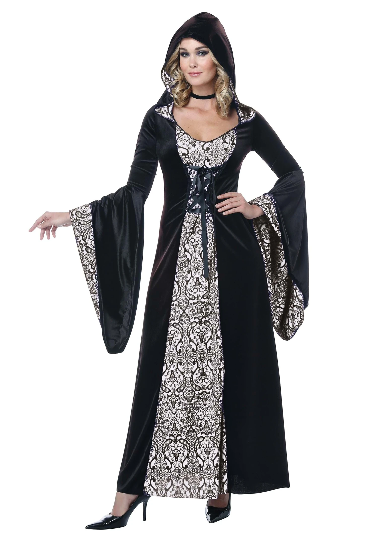 This is a Women’s Deluxe Velvet Damask Hooded Robe Costume.
