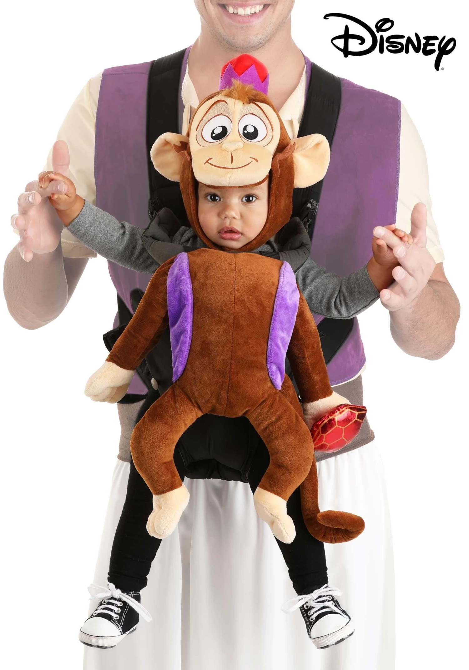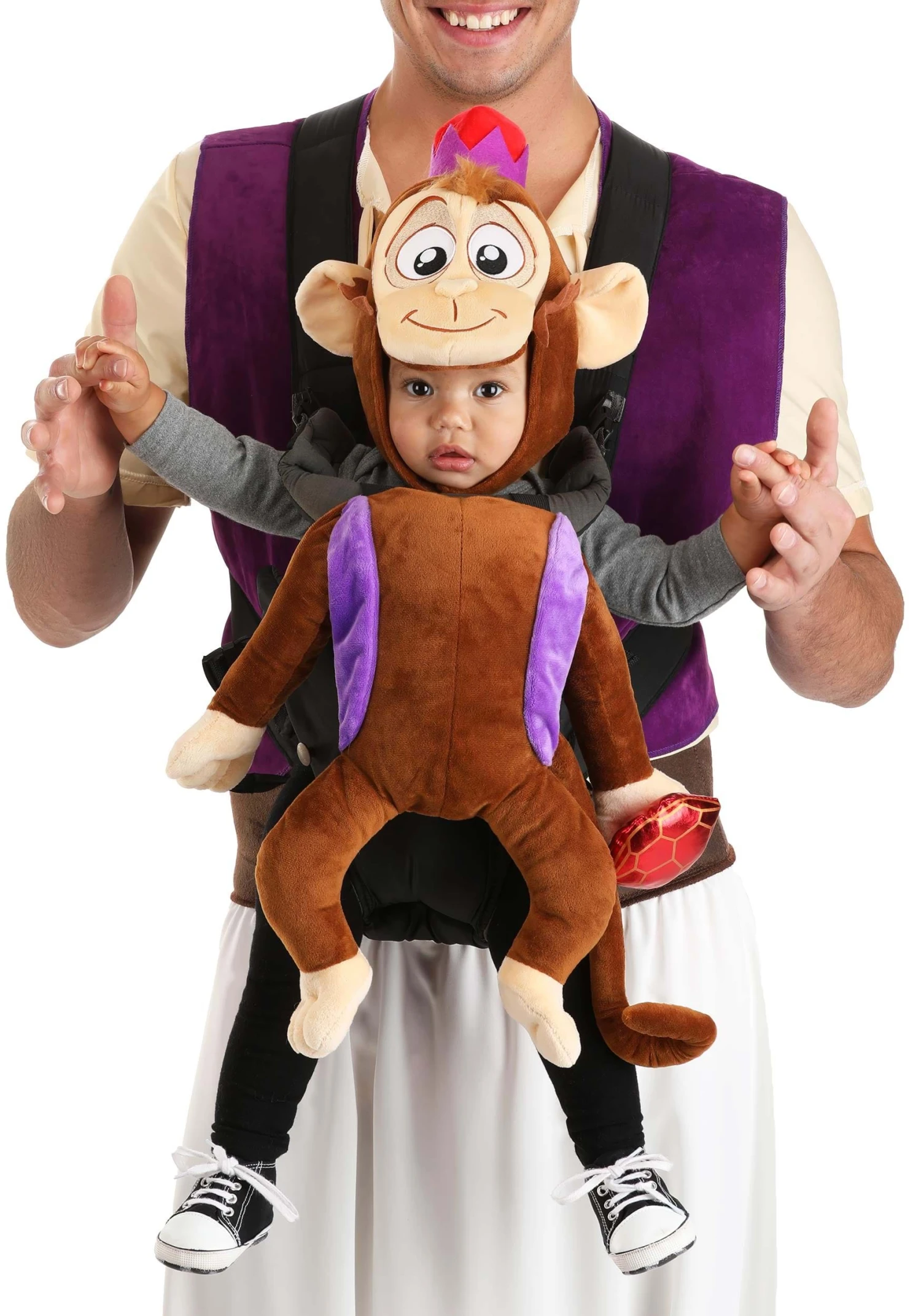 Stay one jump ahead of your little one with this exclusive, officially licensed Disney Aladdin Abu Baby Carrier Costume Cover! The cute velour cover is stuffed and shaped to look like Abu’s furry body. It has sewn-on purple vest panels and a stuffed tail, and its left “hand” holds a jewel made of red fabric. The hat fastens under your child’s chin and is decorated with fabric ears, a mini fez, a tuft of faux fur, and appliqued and embroidered facial features.