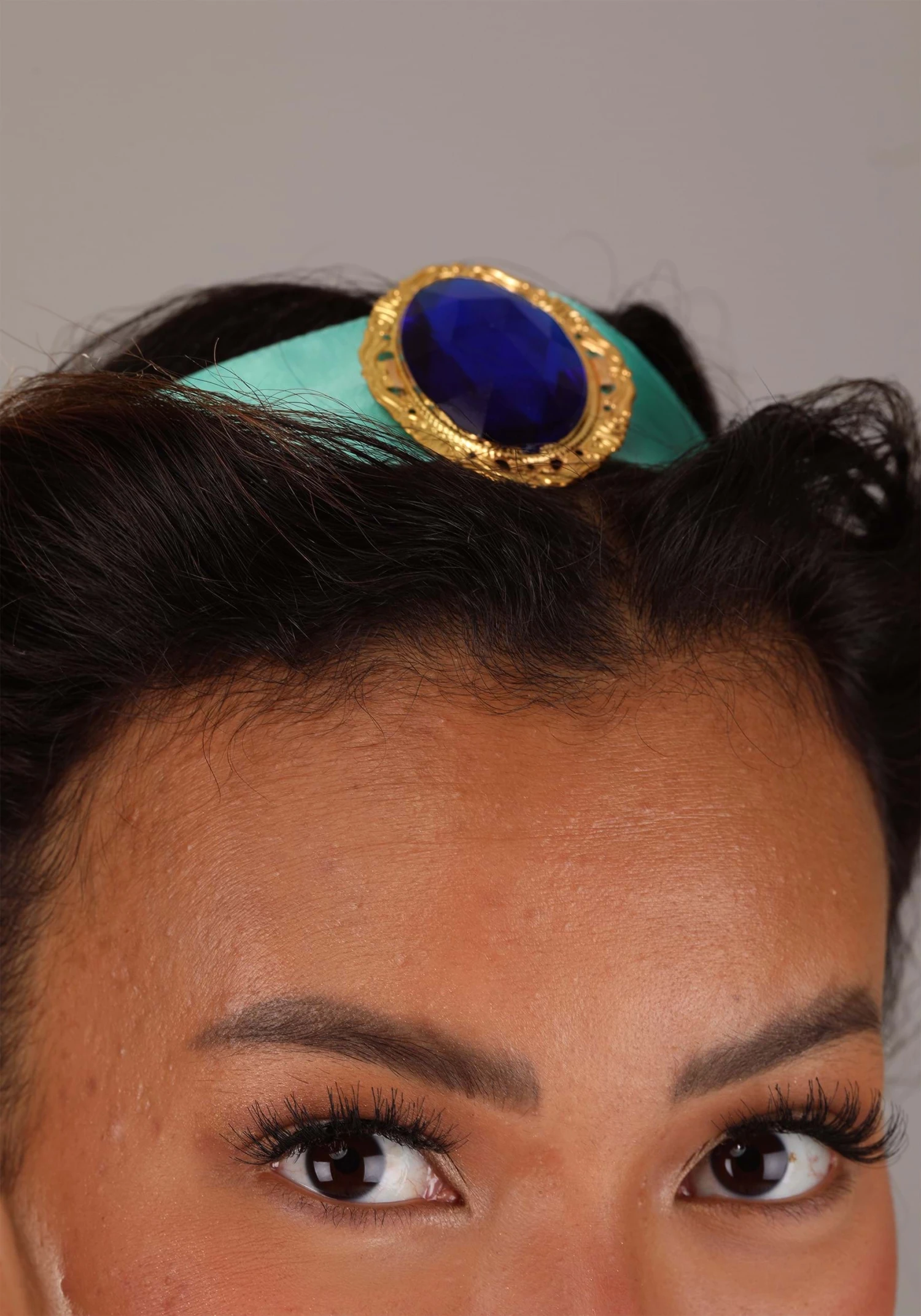 Our Made By Us team created this outfit inspired by the memorable look of the Princess of Agrabah and is happy to bring it to your own kingdom. The costume begins with a shiny blue satin bodysuit featuring semi-sheer mesh fabric along the torso, and draped off-the-shoulder sleeves. The pants have billowing legs and a ribbon waistband. Top off the look with the blue and faux sapphire headband and the hook-and-loop golden necklace!