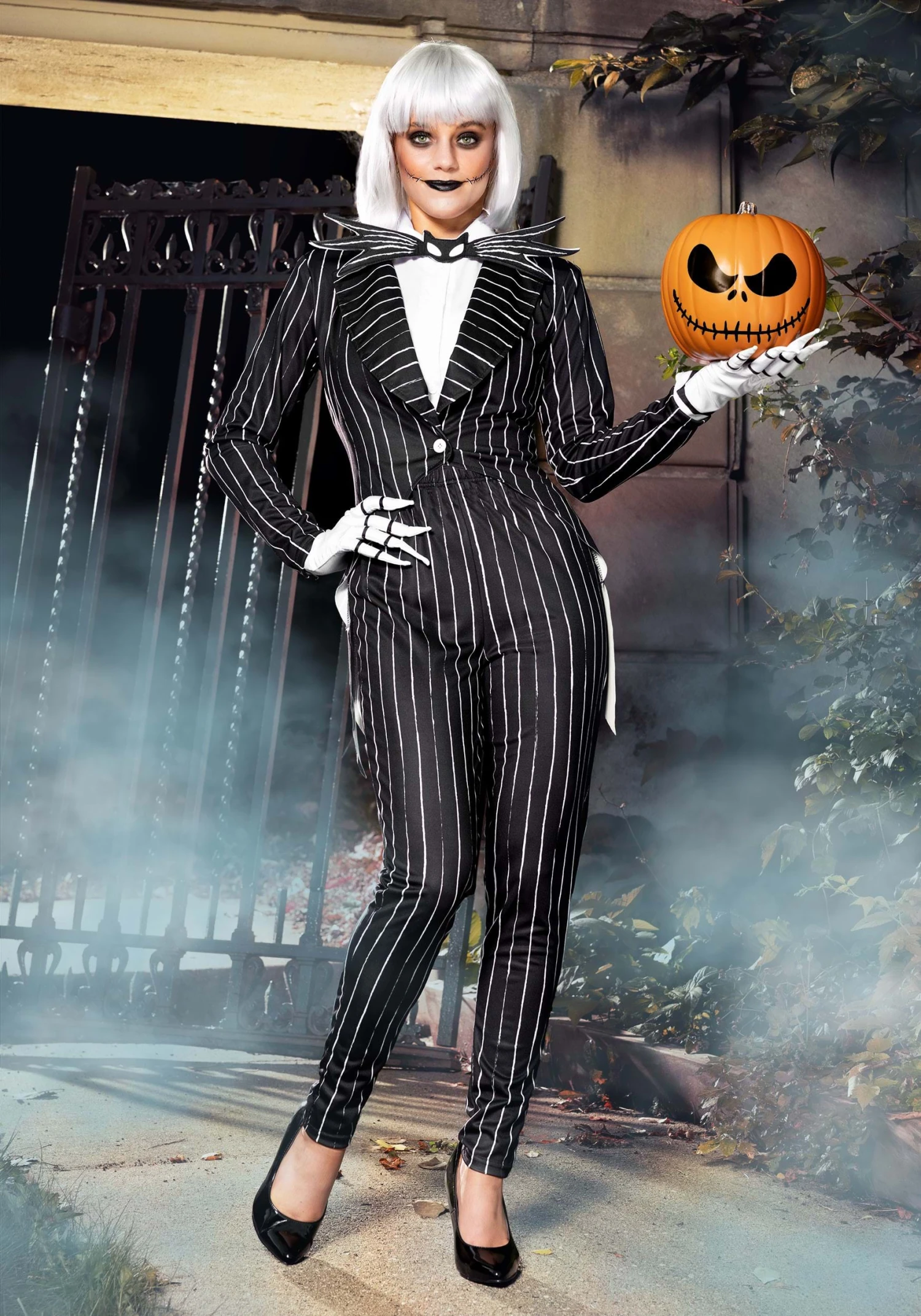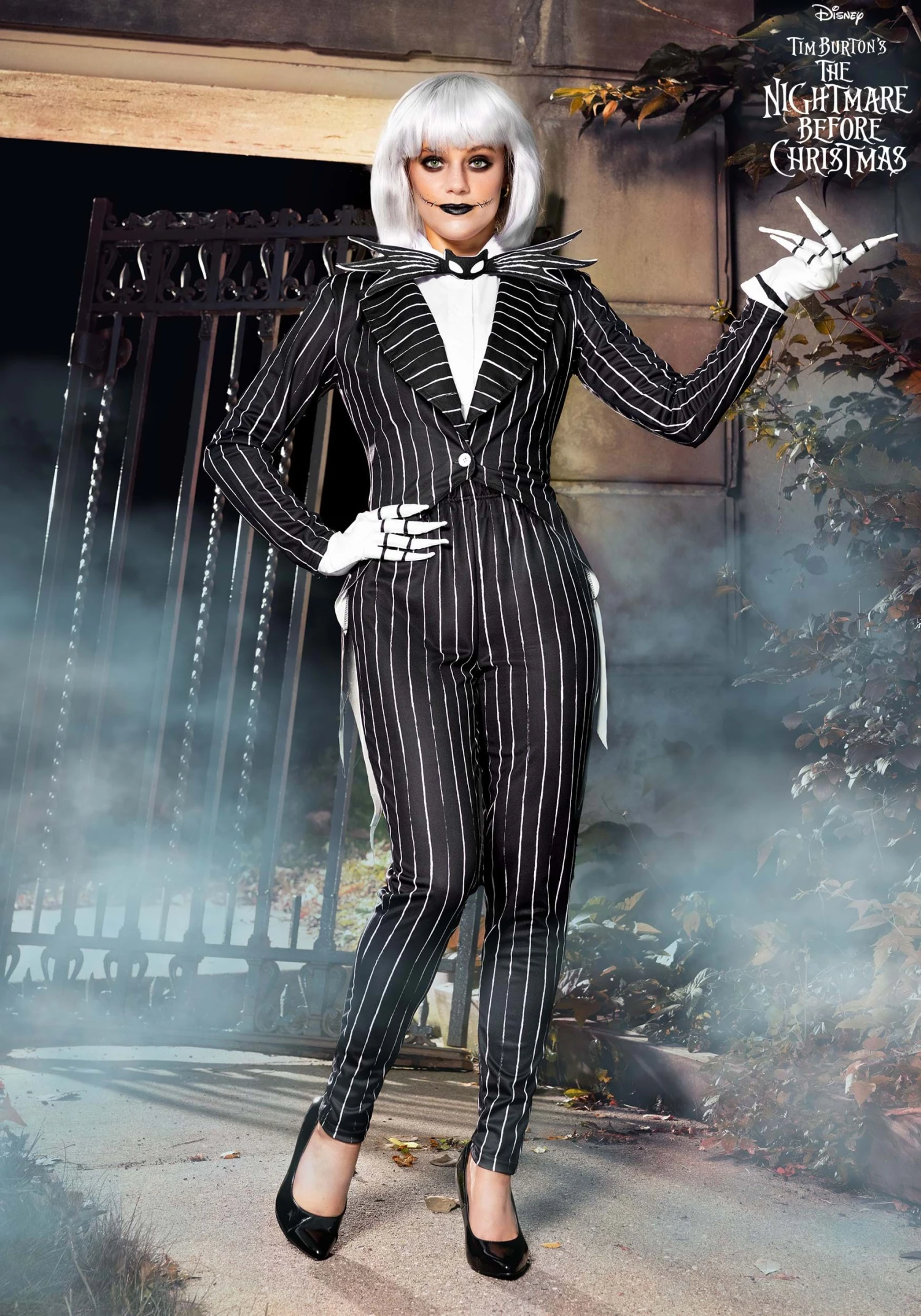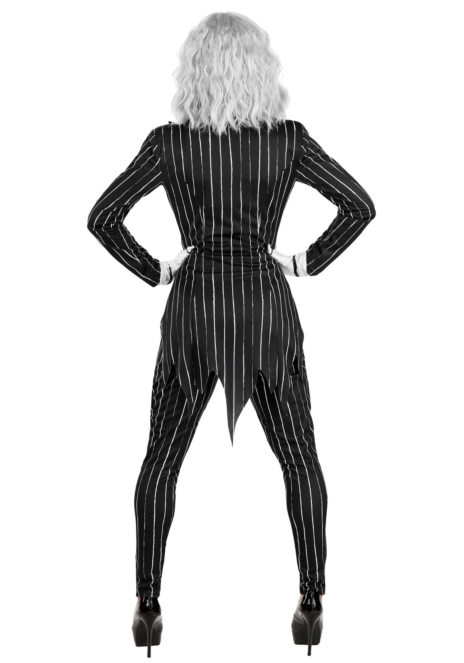 This Women’s Disney Jack Skellington costume is inspired by the famous character. Here, Jack’s pinstripe ensemble is reimagined in this jacket and pair of pants. They feature a curvier cut tailored for a human body, not Jack’s skinny skeleton. The jacket values in the front over the white shirt, and white gloves help your hands appear more bone-like. A bat-shaped bowtie adds the finishing touch, so you’ll be ready to run Halloween however you want!