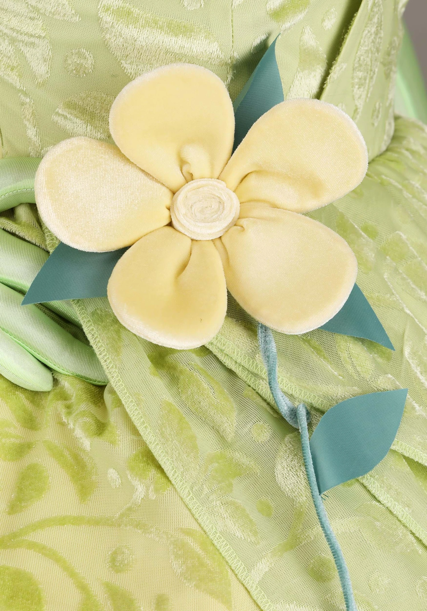 - Dress top layer has velvet fabric with burnout petals