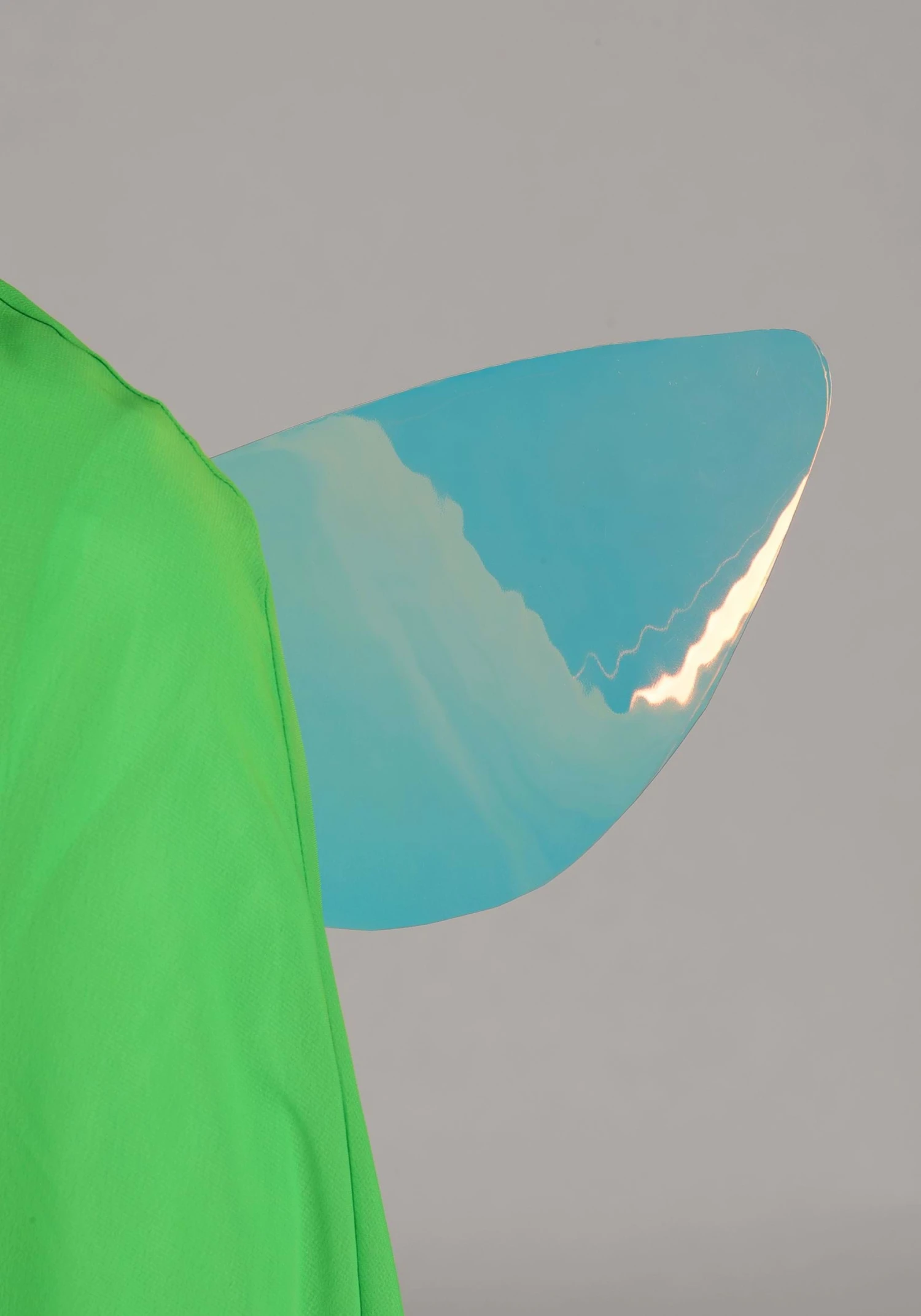 - Two tone taffeta, long sleeve dress has a zipper down center back, taffeta underskirt, transparent iridescent wings sewn to the back of the dress