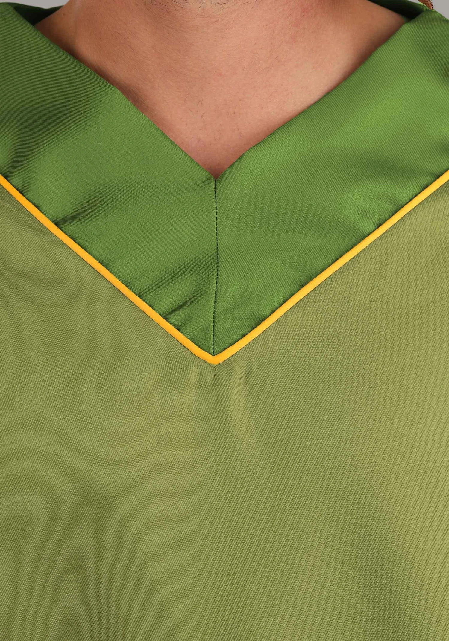- Pullover, broad cloth poncho has a gold trim, hook and loop fastener on the neck