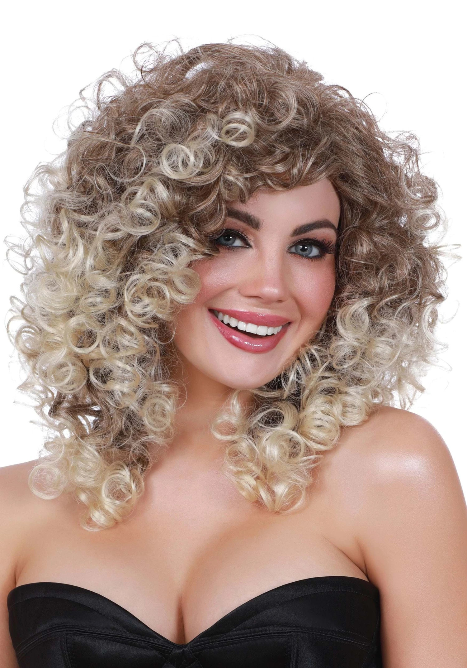 This is a Women’s Long Curly with Dark Roots Wig.
