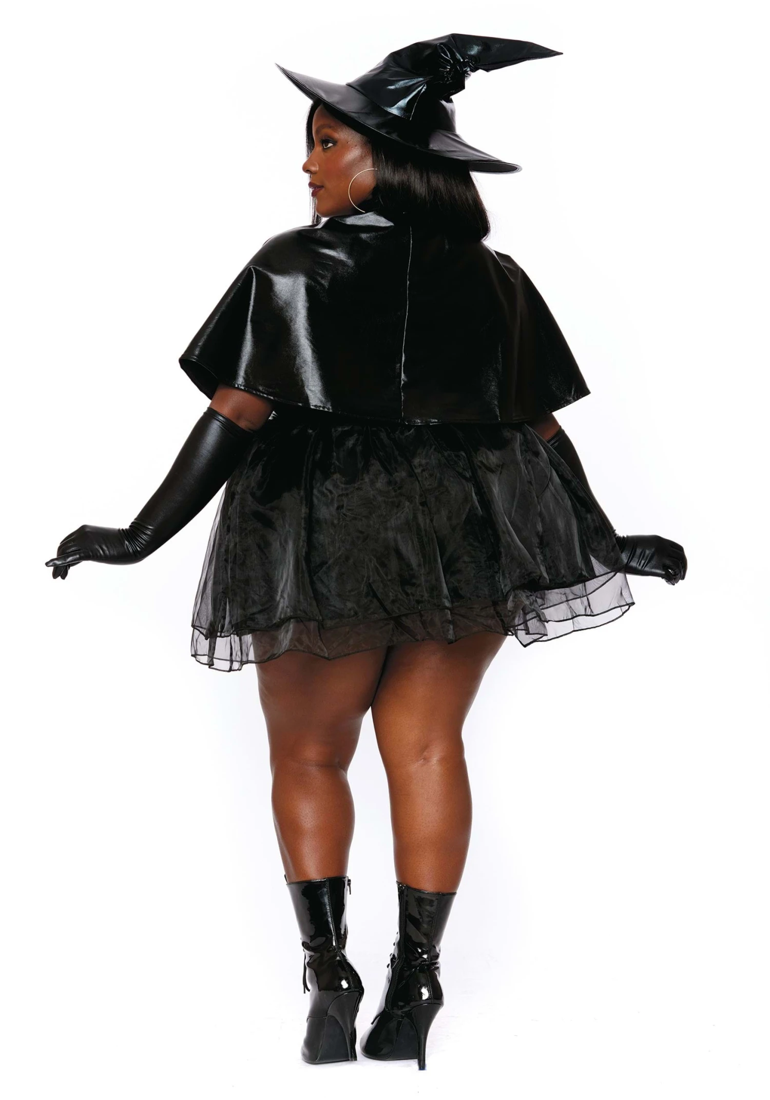 - Wet look cape has hook and loop fasteners that secure to the dress