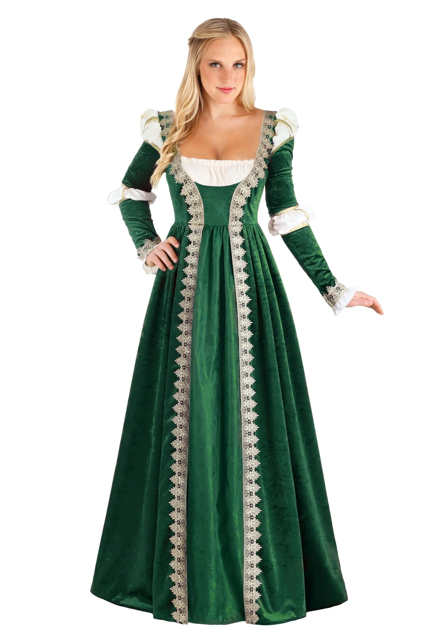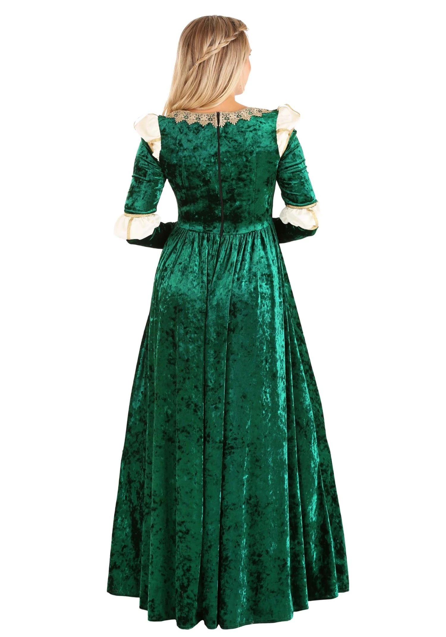 This Made By Us emerald gown was designed by our in-house creative team. The long gown zips up the back, making slipping into this look easy. The velvet gown is trimmed with ornate off-white lace down the front. The white panel along the neckline and along the sleeves would make this a fashionable choice in a royal court. This high-quality gown is perfect for Renaissance Fairs and themed costume parties, making it a staple in your costume wardrobe!