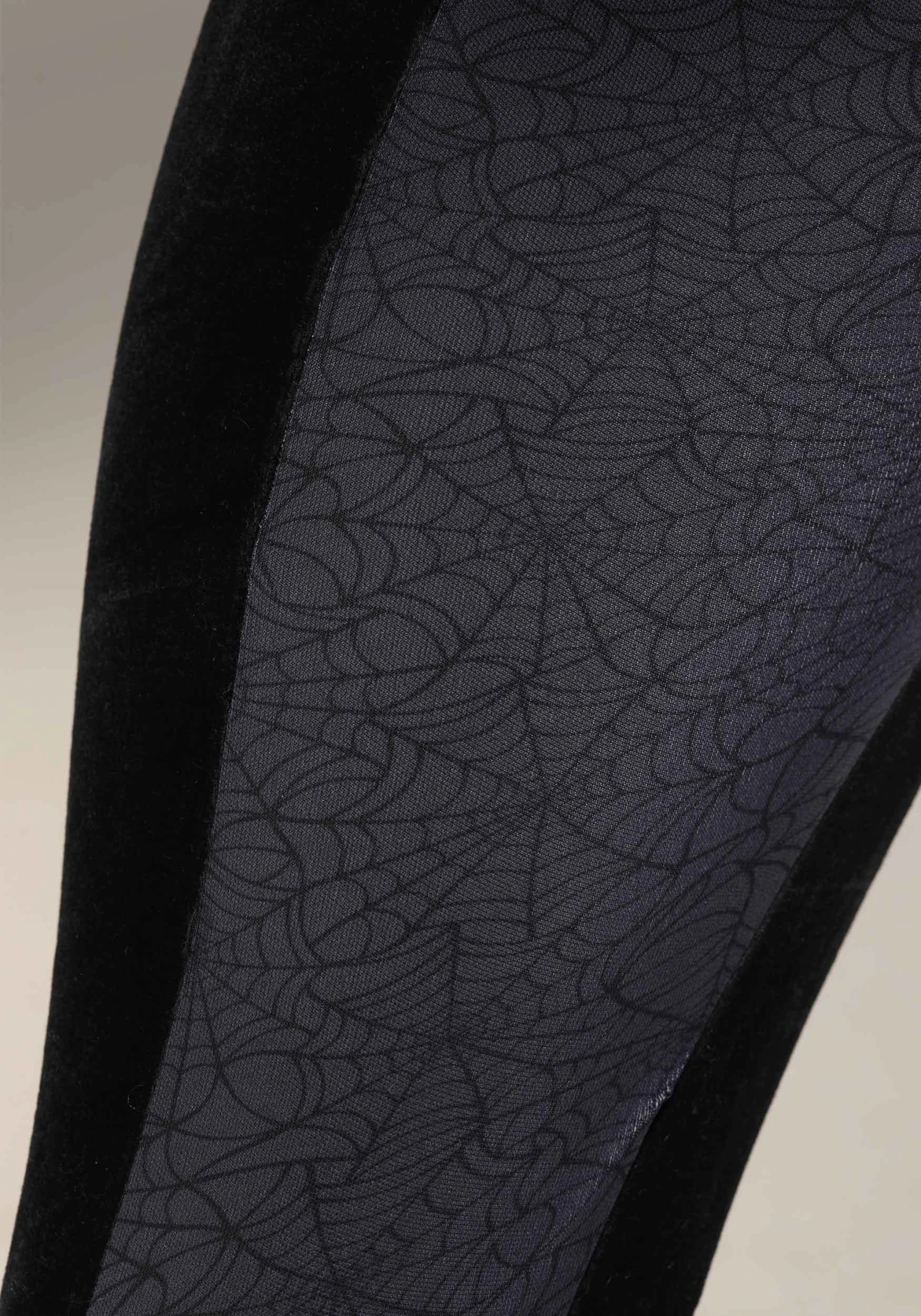 - Stretch velvet jumpsuit has sublimated jersey knit front, red holographic lame fabric