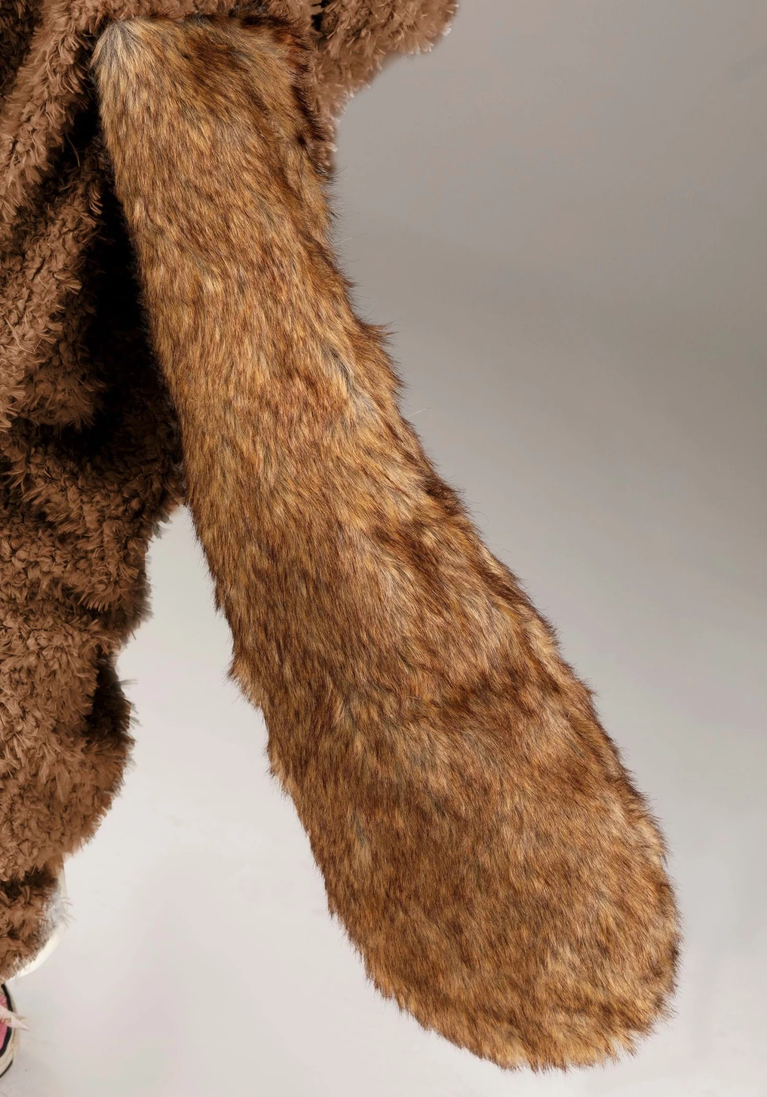 - Attached hood has interlock knit lining, embroidered nose and eyes, foam backed minky ears