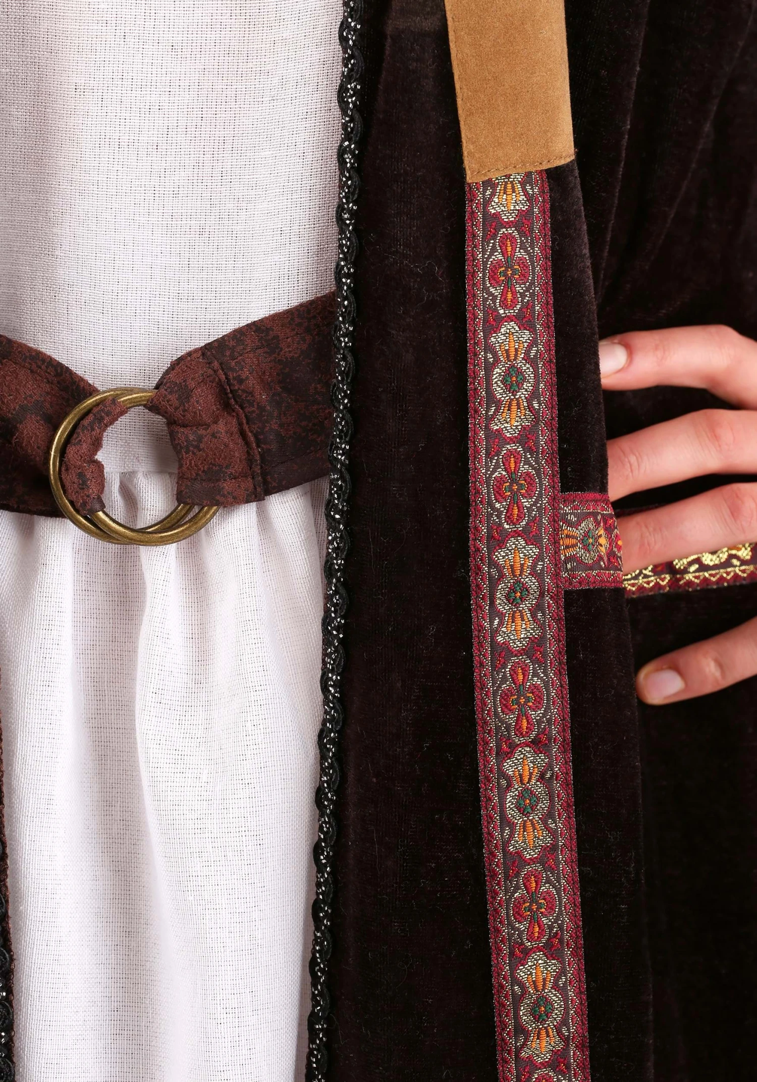 - Dress: 70% polyester 20% cotton 10% rayon monk’s cloth, Vest and belt 100% polyester velvet and faux suede