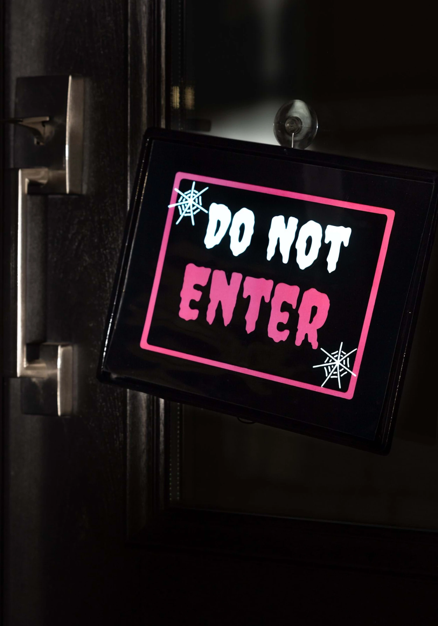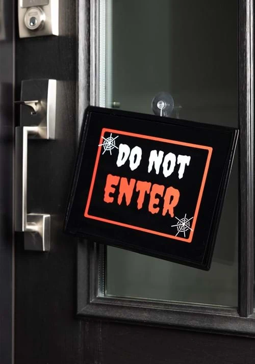 On the front, “Do Not Enter” is printed in vivid red and white to stand out against the dark background. In its drippy font and surrounded by clean white spiderweb graphics, the sign has a classic Halloween look. But with 2 AA batteries installed, this sign lights up with a neon glow that’s sure to give your entryway a perfect mix of happy and haunting!