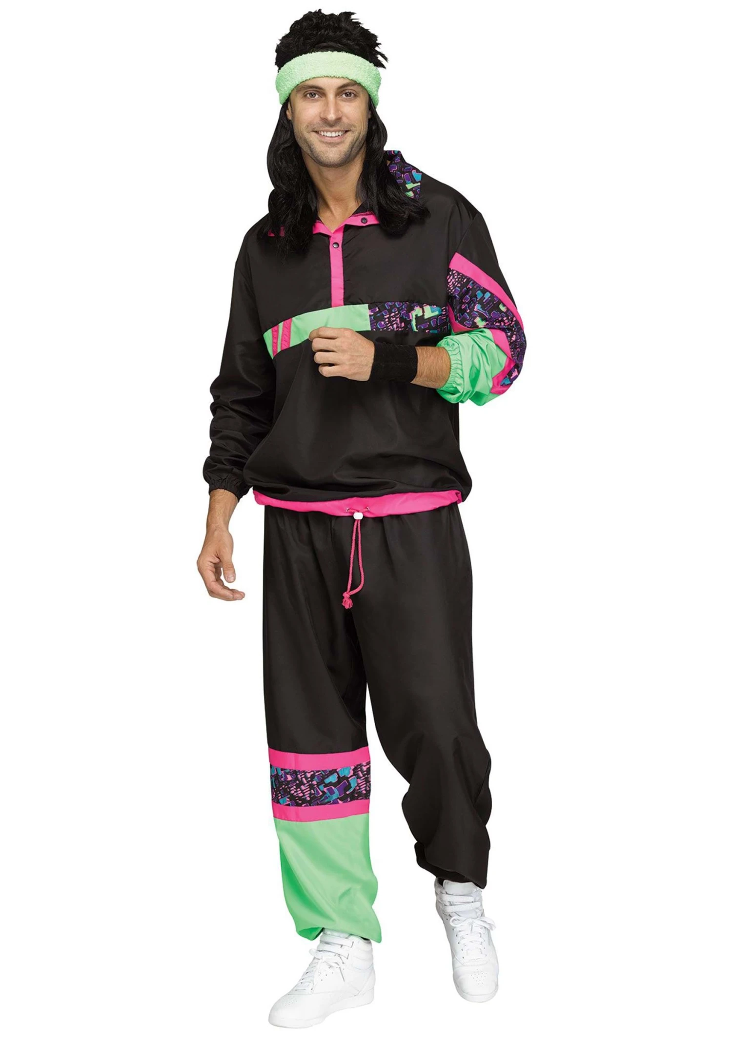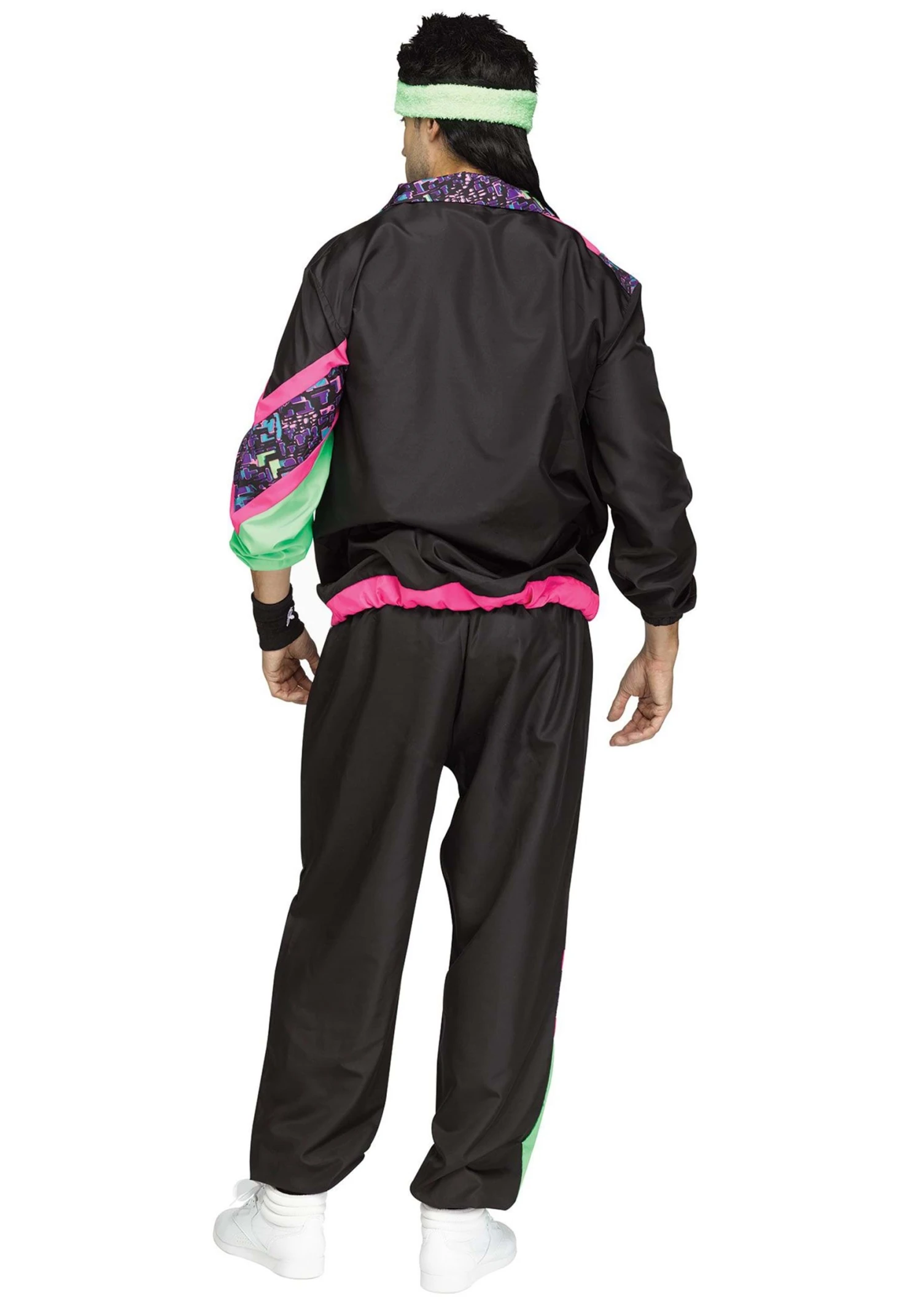 Show off your athletic… fashion sense when you wear this hilarious 80’s Track Suit Costume for Men! Made of polyester windbreaker material, the pullover jacket has pink trim at the neckline and hemline, and is embellished with green, pink, and patterned fabric. The matching pants have a drawsting cord sewn into the pink waistband. The right leg features green, pink, and patterned embellishments. Don’t forget to add your favorite pair of neon tennis shoes!