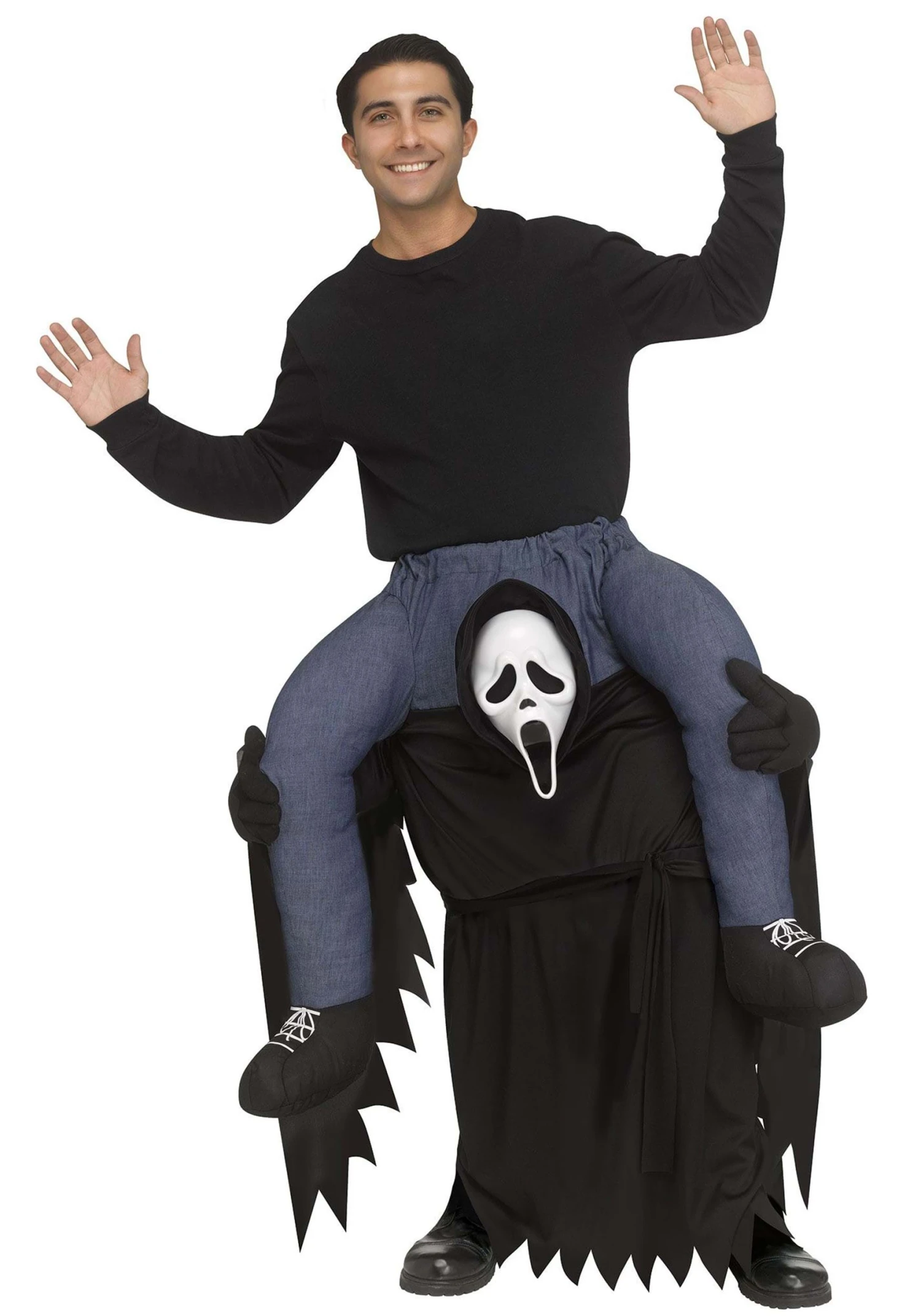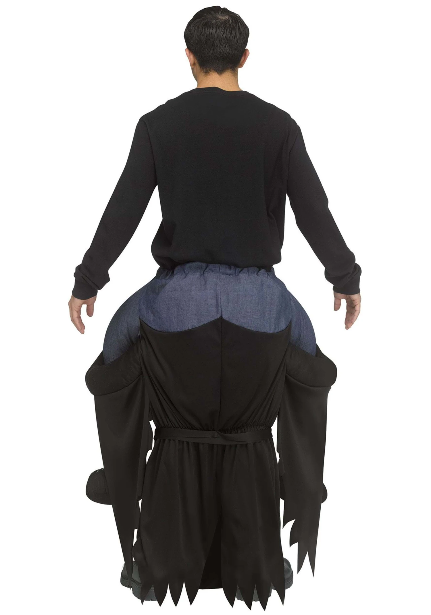 This officially licensed costume is all one piece, designed to look like you’re riding on the shoulders of the one and only Ghost Face. The pants include fiber-filled dummy legs that drape over his shoulders, complete with little black shoes to sell the illusion. Below that, Ghost Face’s own robe hangs dramatically down your real legs—adding some classic slasher vibes to the comedy gold happening up top.