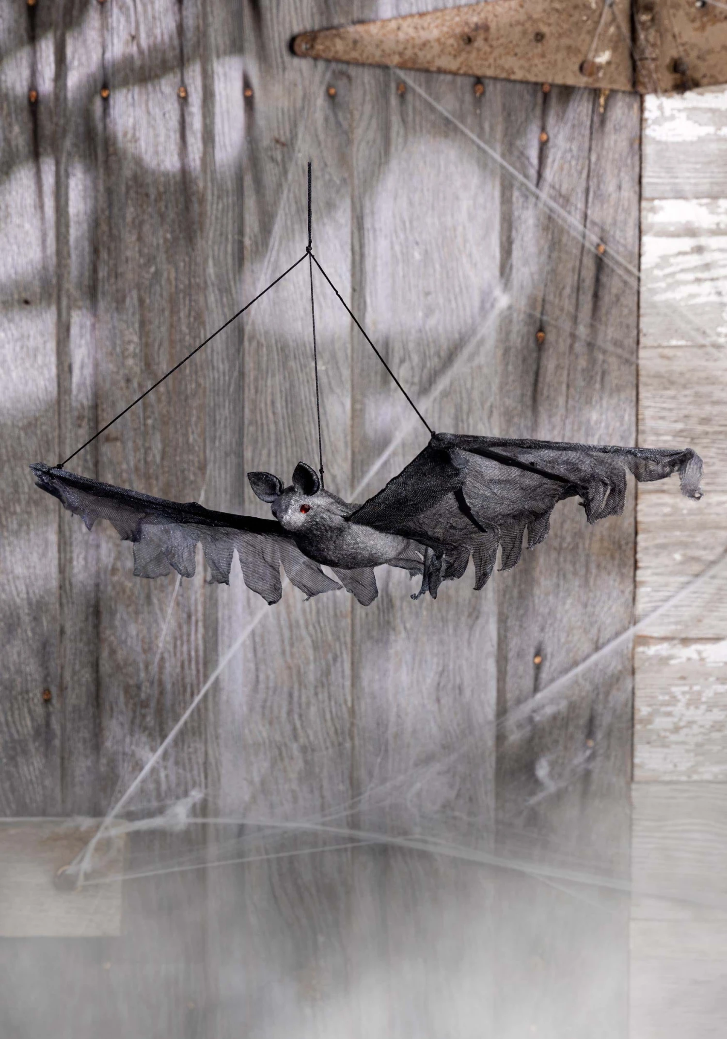 Complete your Halloween scene with an exclusive Hanging Gray Bat Decoration! The prop’s foam body is approximately seven inches long, and its head is decorated with eye and ear details. The plastic wing bones are covered in tattered gray mesh. The outstretched wings measure nineteen inches from end to end. A cord loop is attached to the top so that you can hang the decoration where desired.