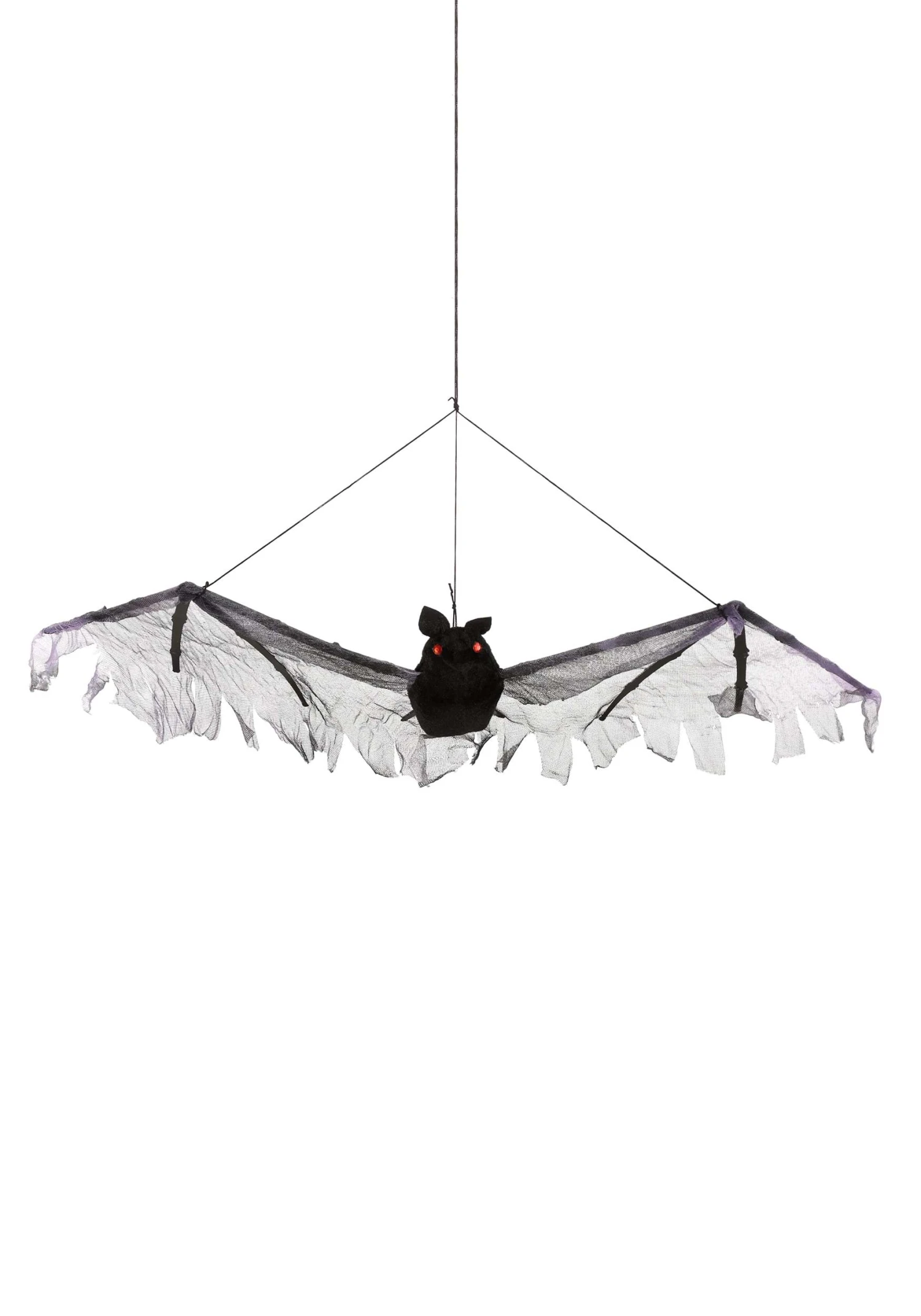 You’ll go batty for this exclusive Hanging Bat Decoration! The prop’s body is made of black foam and measures approximately seven inches long. Its wings are made of plastic and mesh, and measure about nineteen inches from tip to tip. A cord loop is attached to the top for hanging.