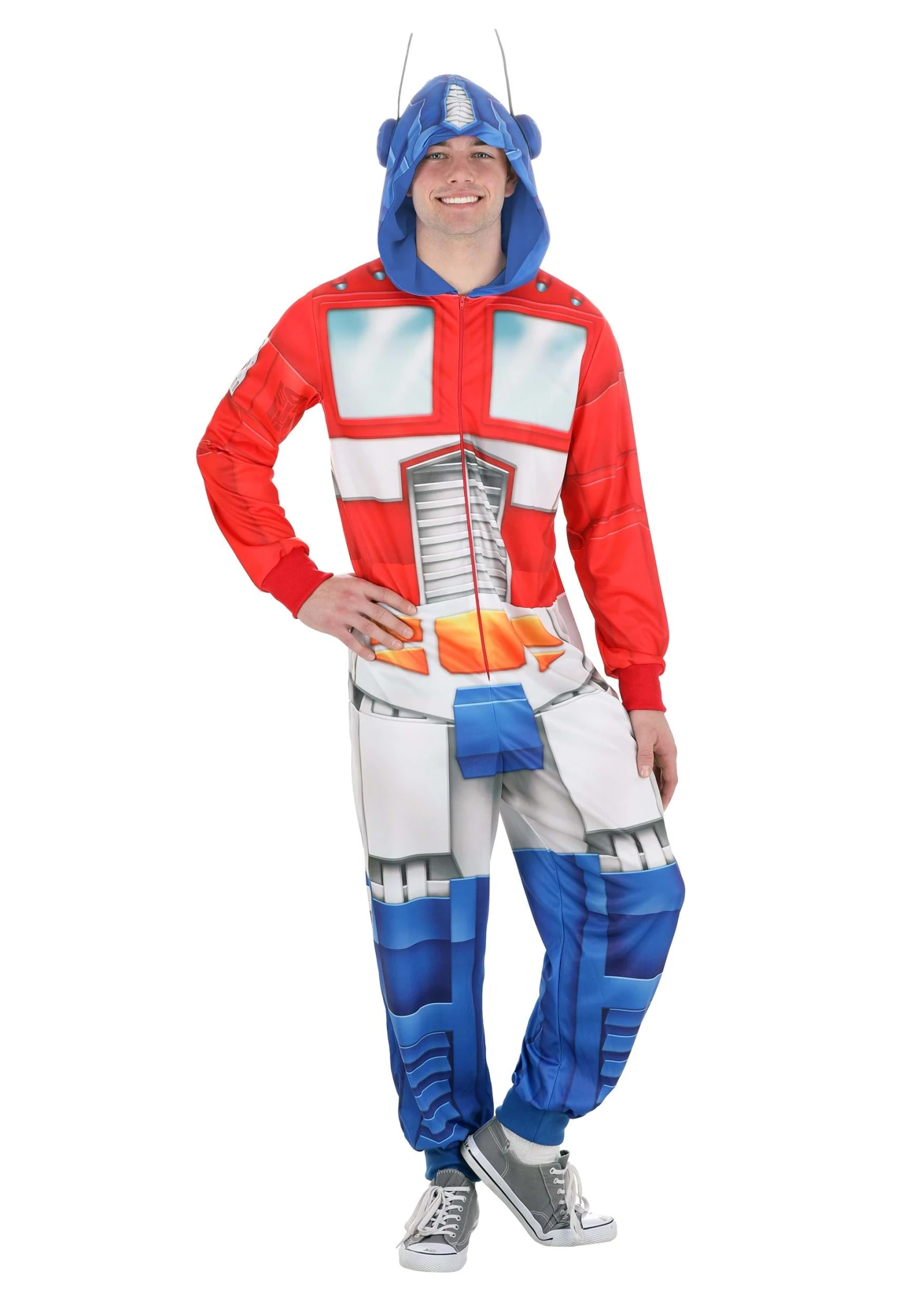 Transforming has never been so easy. Thanks to this union suit, you’ll be able to easily turn into this famous Autobot. There is a single zipper that goes down the center of this costume’s front side. Once your slip it on and zip it up your transformation will be nearly complete. The jumpsuit is covered in an all-over print designed after Optimus’ battle mode in the animated series.