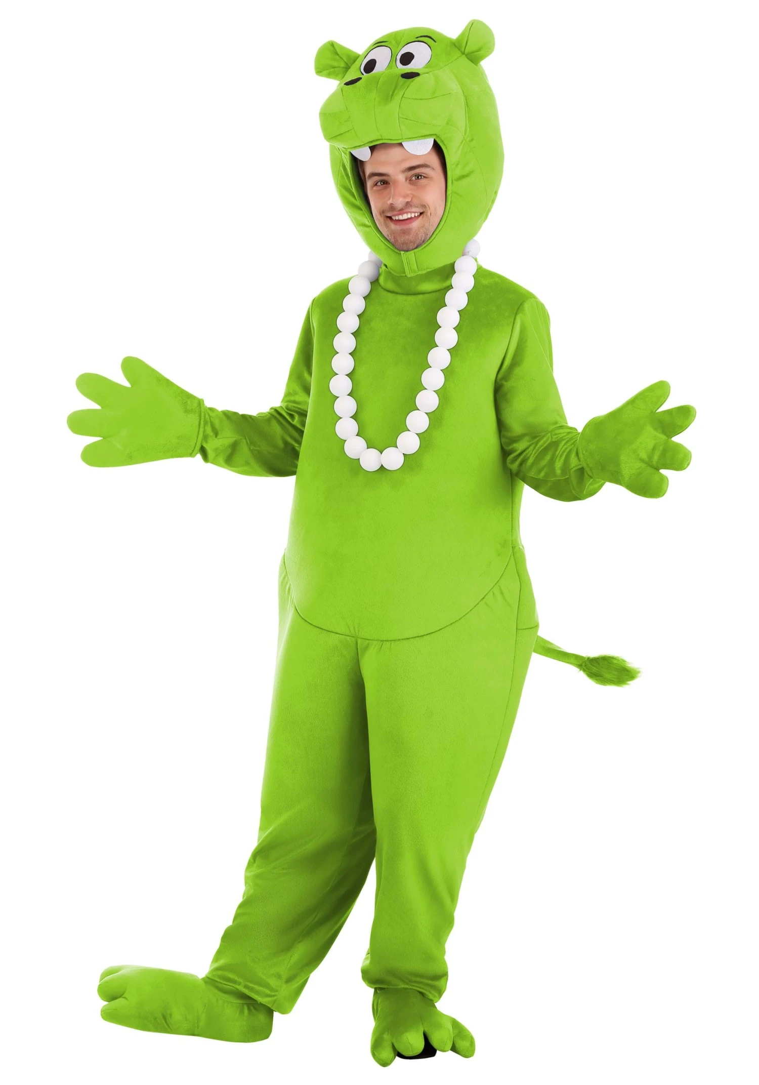 This fully licensed Hungry Hungry Hippo costume from Hasbro has our whole company chuckling. The ultimate nostalgic costume was designed by our in-house creative team. It features a soft, green jumpsuit that zips up the back and can fit over your own clothing, making it a great option for when you need to change after work or head out trick-or-treating on a cold Halloween night. The green hippo costume also features oversized mitts, shoe covers, and an adorable mask that looks ready to chomp. The mask has an open face letting you easily see, talk, and most importantly, eat. To top it all off, our design team even added a necklace resembling the marbles straight from the Hungry Hungry Hippos game that you played as a kid!