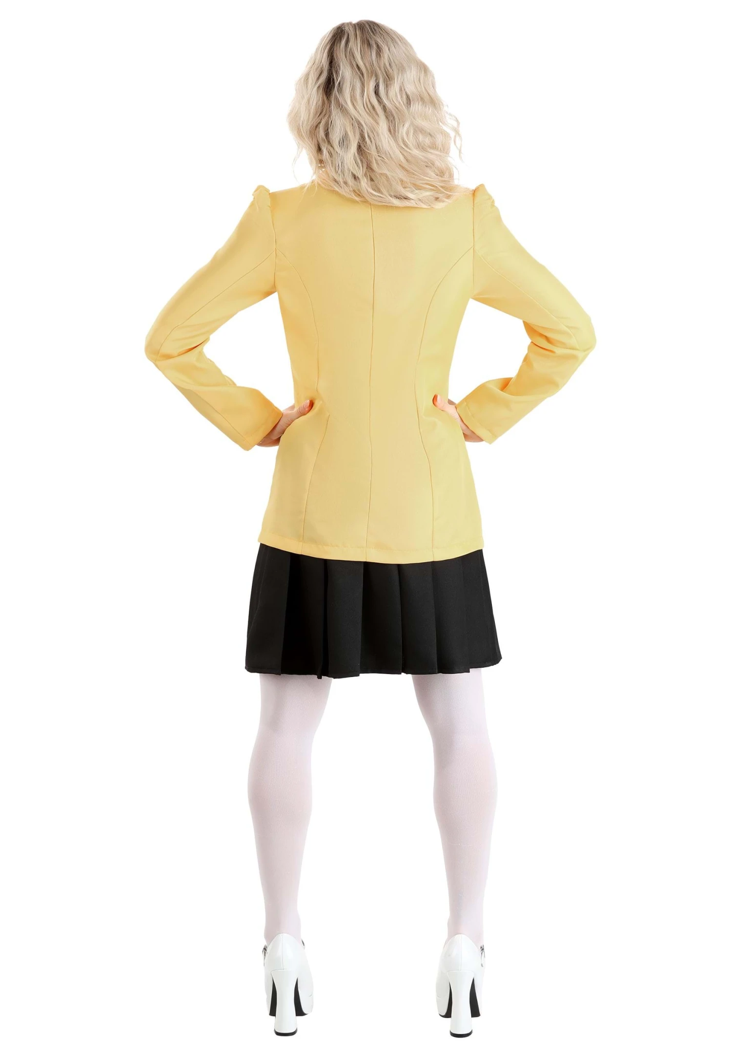 The costume includes a bright yellow poly-cotton twill jacket with a structured silhouette, complete with set-in shoulder pads and fabric-covered values that march down the front with attitude. Underneath, the white shirt front offers crisp contrast with a full value placket, collar, and stretchy knit back that helps it stay in place while you’re busy running the student body (and everyone else’s business).