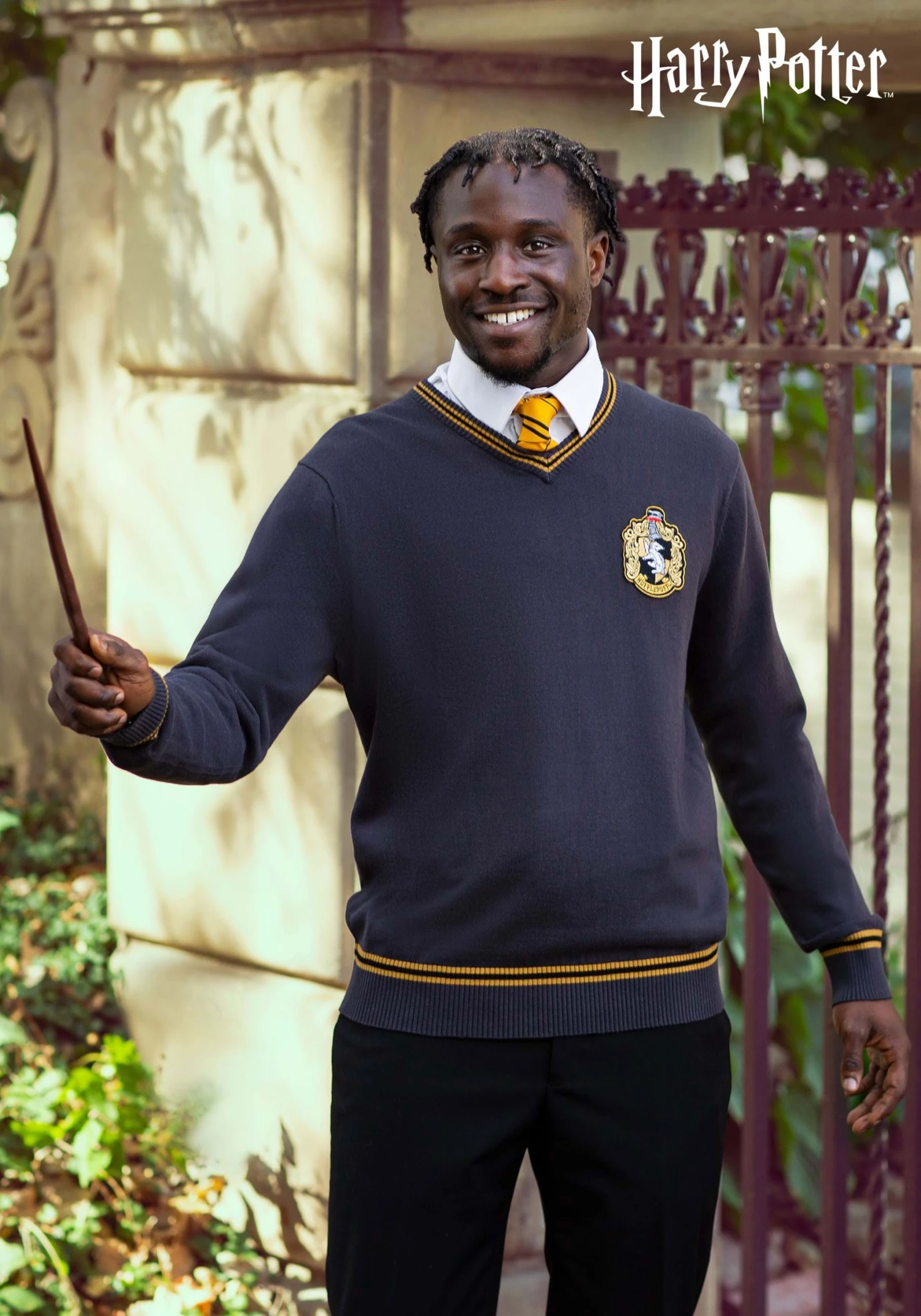 - Soft v-neck sweater has a Hufflepuff patch on the left side
